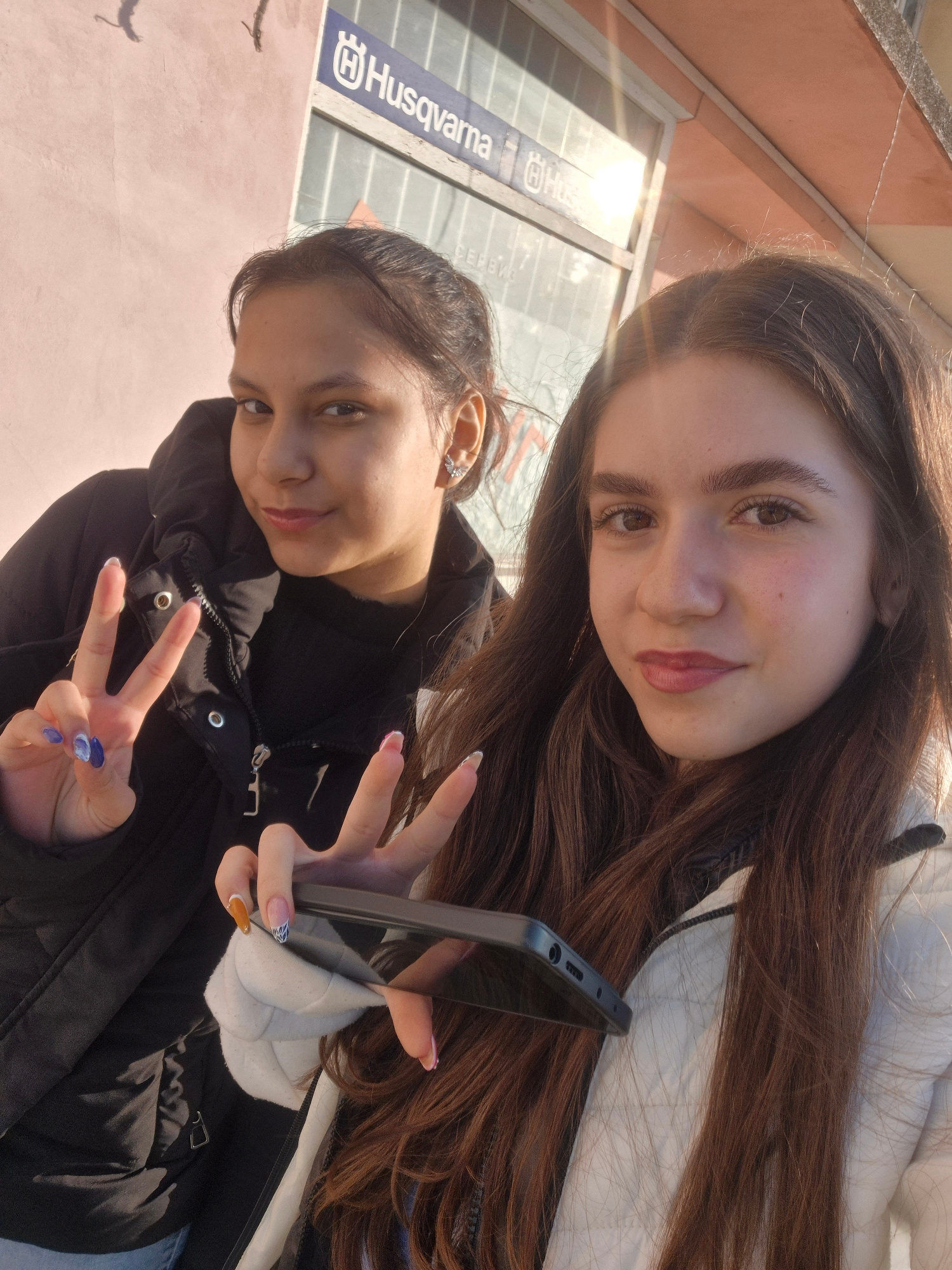 Two young women pose for a selfie with a smartphone. The foreground woman has long brown hair and light skin; the background woman has dark hair, medium skin tone, and is making a peace sign. They app…read more