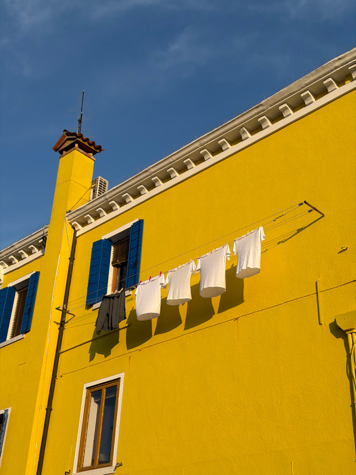The image displays a vibrant yellow building facade under a clear blue sky in Burano, Venice, Italy. A white architectural cornice, featuring regularly spaced corbels and anti-pigeon spikes, runs alon…read more