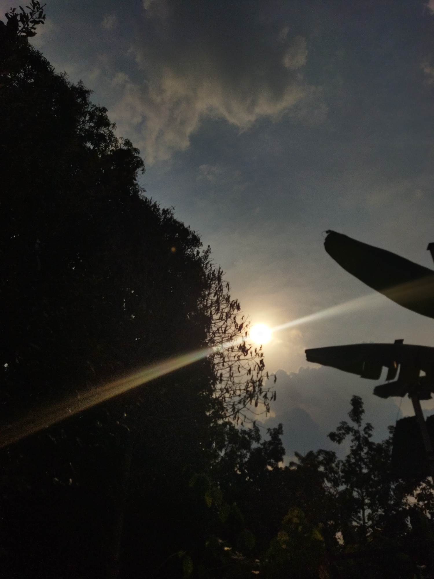 The image depicts a sunlit scene in Tinaquillo, Venezuela. The sun is positioned centrally in the image, partially obscured by tree branches. A bright beam of light radiates from the sun. Silhouetted…read more