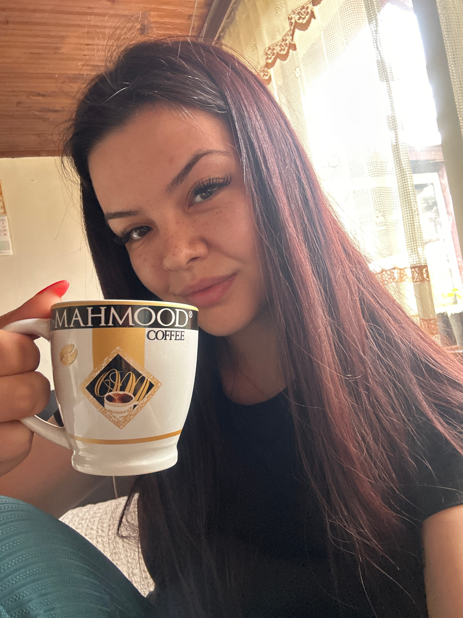 A young woman with long, dark auburn hair and freckles is holding a white ceramic coffee mug with the brand name "MAHMOOD" printed on it. The woman is looking down at the camera with a slight smile. S…read more