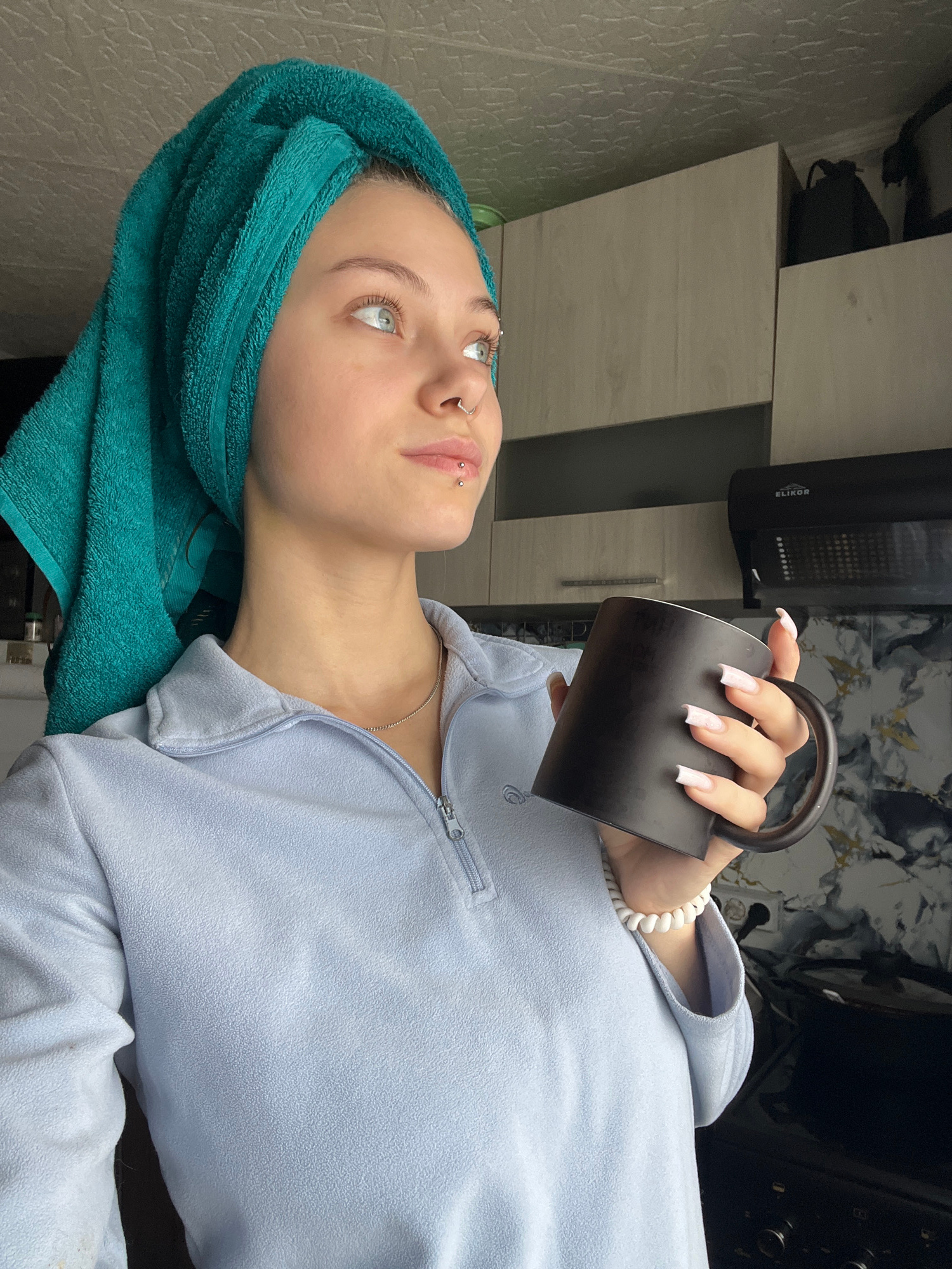 A young woman with a green towel wrapped around her head holds a black mug with white-tipped nails, wearing a light blue fleece jacket, with a silver chain and white beaded bracelet, in a kitchen sett…read more