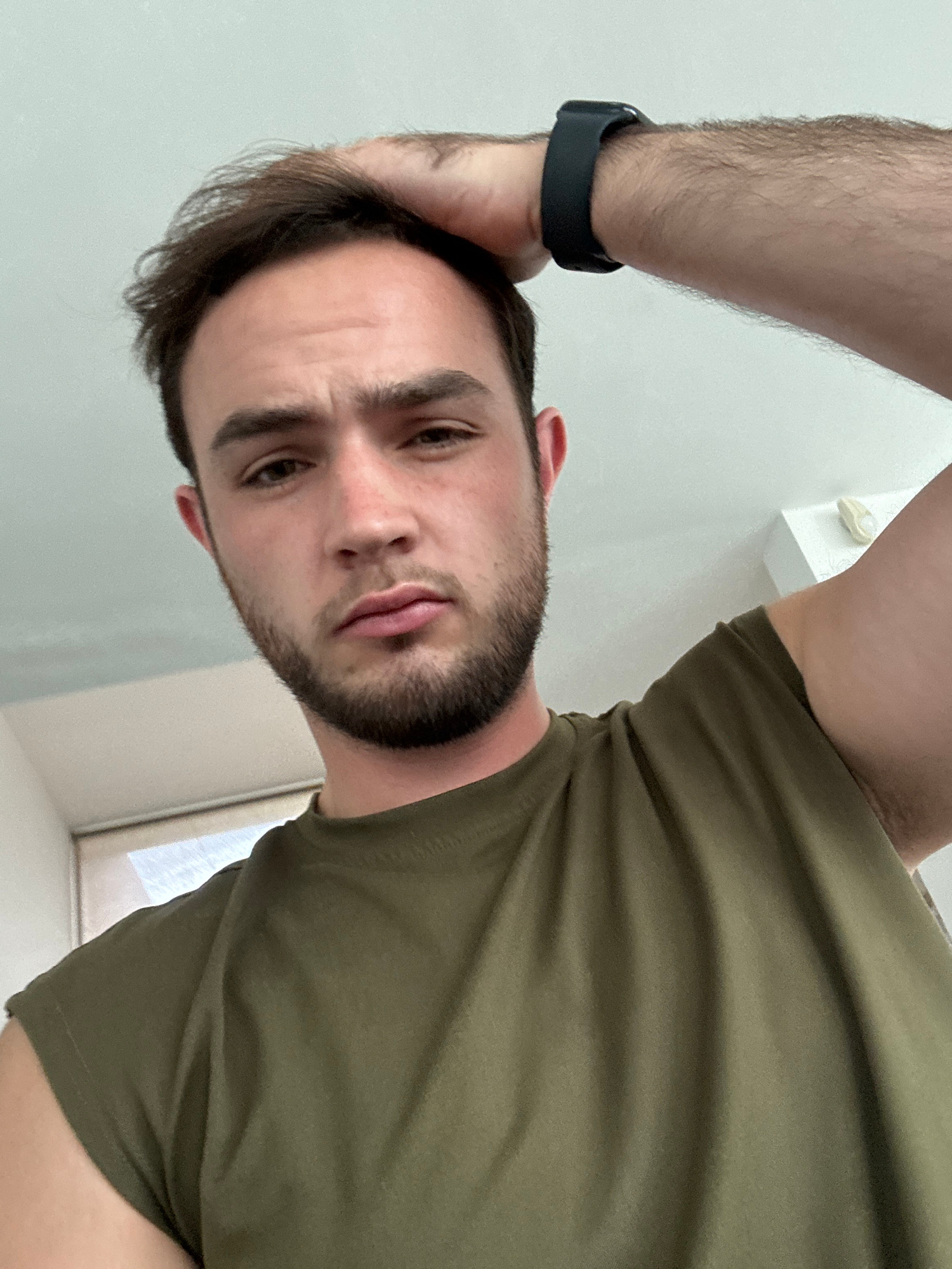 A man with dark hair and a beard is positioned in the center of the frame, looking down at the camera. He is wearing a dark green t-shirt and a black smartwatch on his left wrist. His left hand is plaβ¦read more