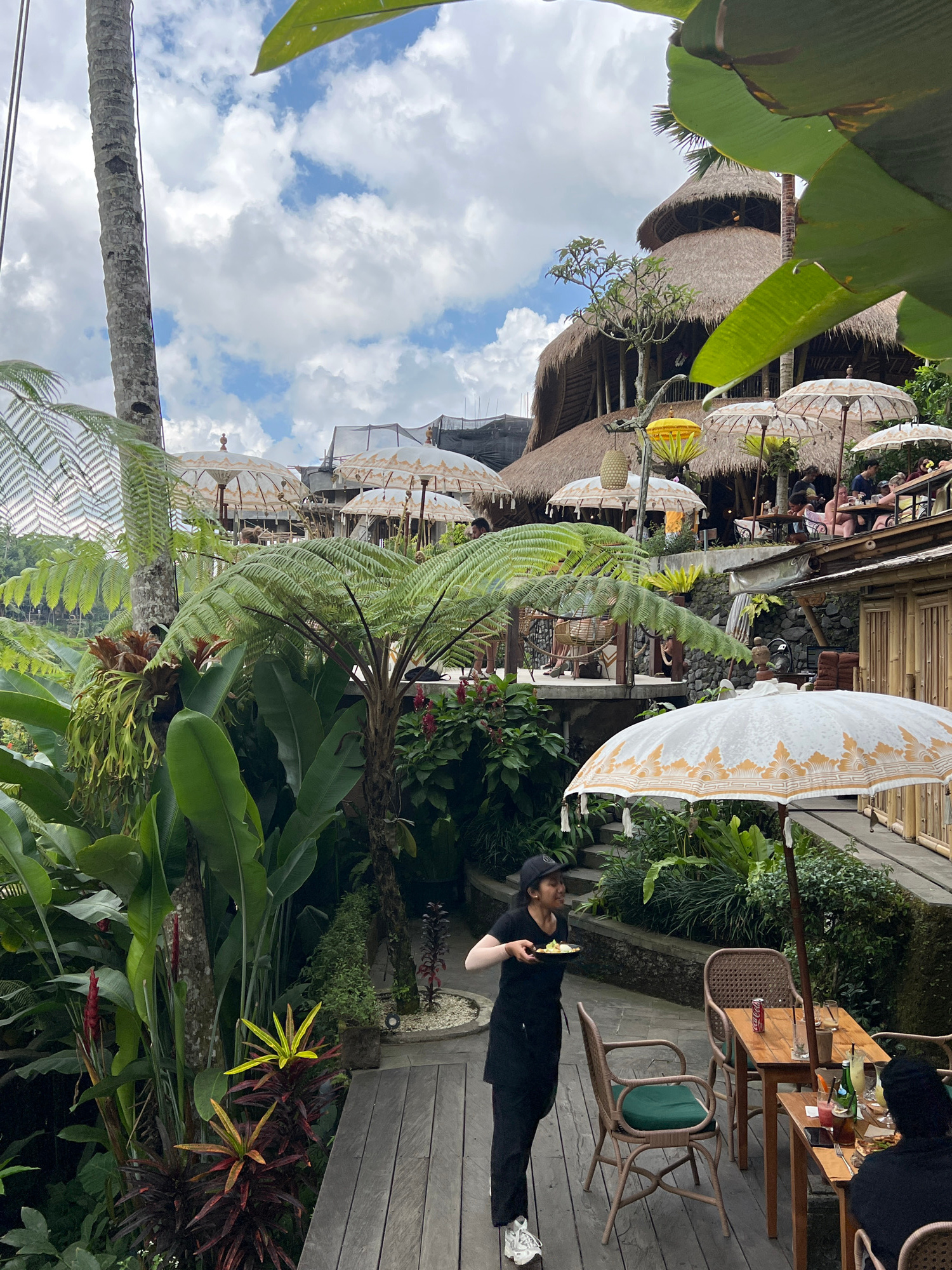 The image shows a woman in black clothing standing on a wooden platform in a tropical setting, likely a restaurant or outdoor space in Tegallalang, Indonesia. She is holding a piece of food, possibly…read more
