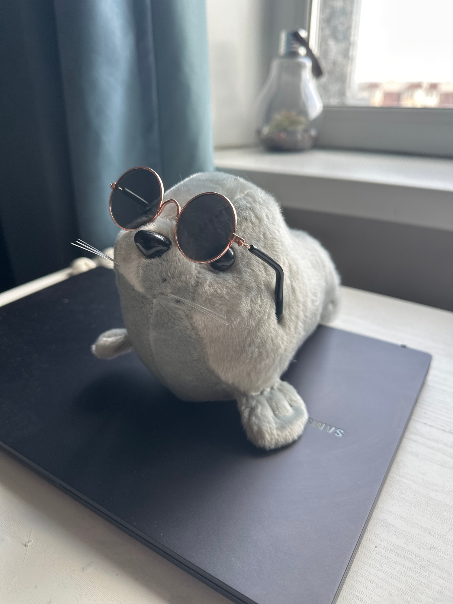 The image presents a light grey plush seal toy, prominently featured wearing small, round, dark sunglasses with rose gold frames. The seal is positioned on a dark grey Samsung laptop, which lies flat…read more
