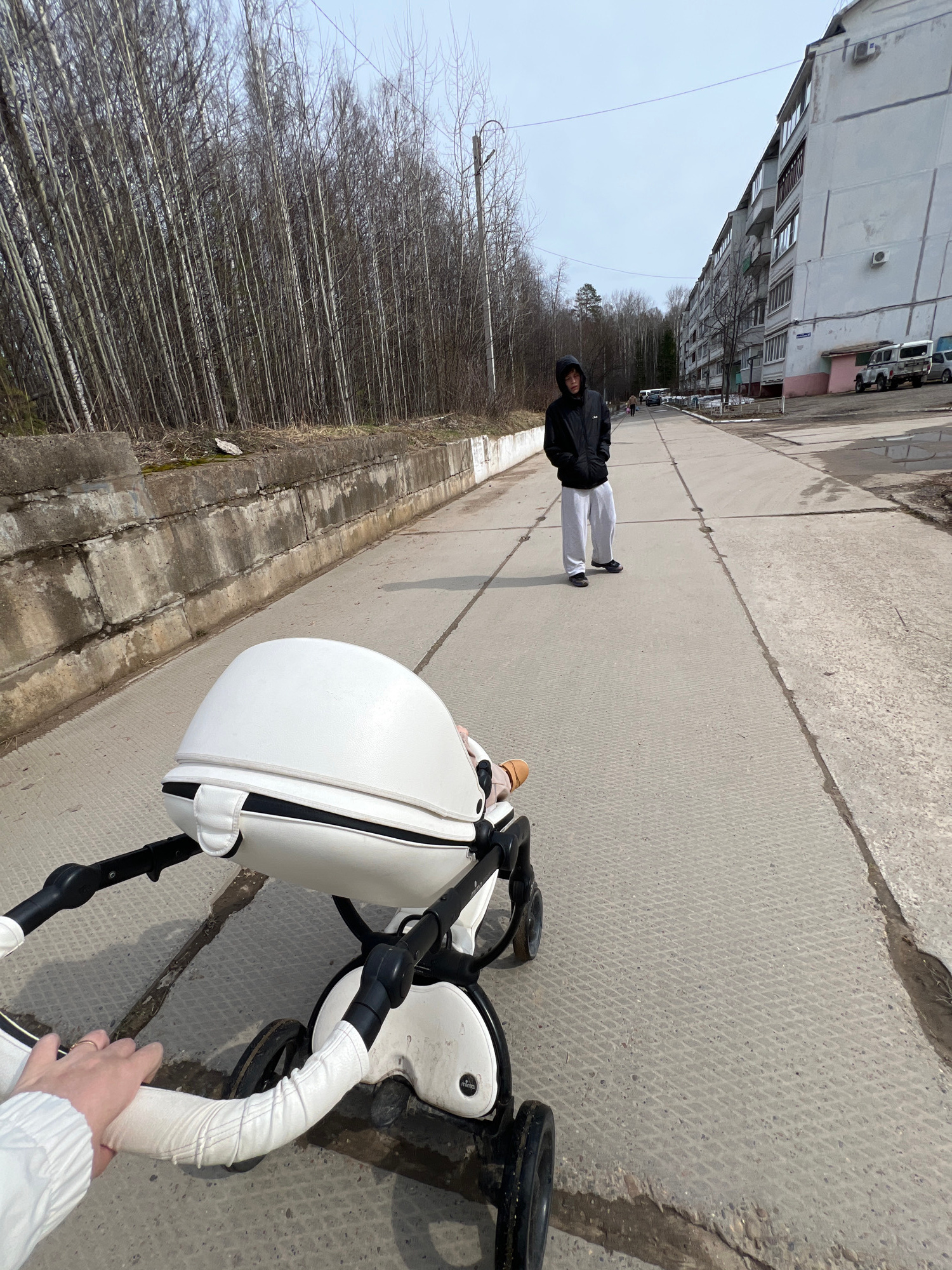 The image shows a person pushing a white stroller on a concrete sidewalk in Noviy, Russia. A person wearing a black jacket and light gray pants walks ahead on the sidewalk. To the left is a row of bar…read more