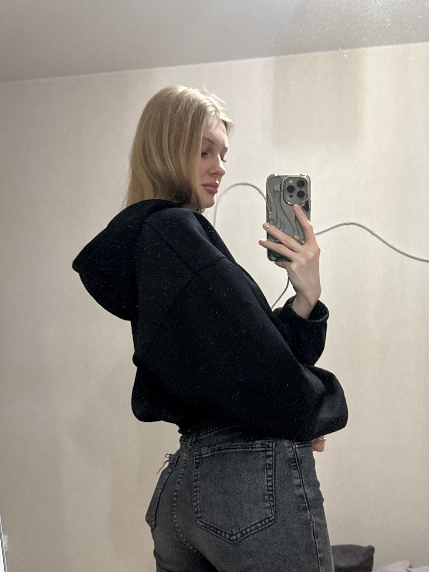 A fair-skinned young woman with long blonde hair is taking a selfie in a mirror. She is wearing a black hooded sweatshirt and grey jeans. She holds a silver phone with a multi-camera lens system in he…read more