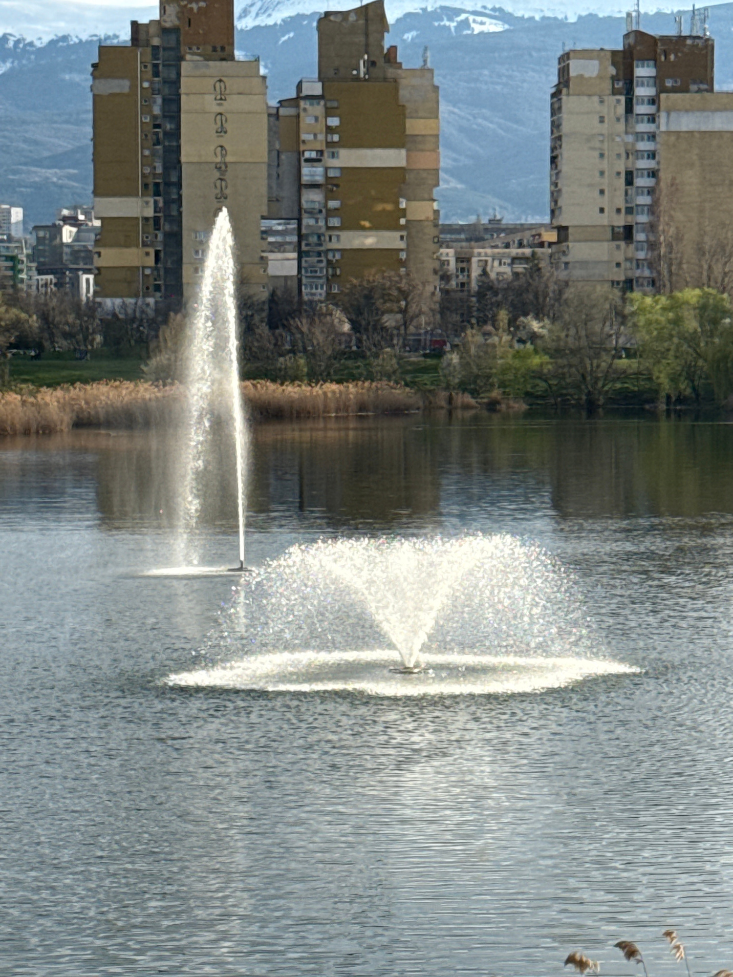 The image shows a lake with two fountains spraying water. On the left side of the lake are buildings and trees. In the background are mountains. The location is likely the city of Sofia, Bulgaria.