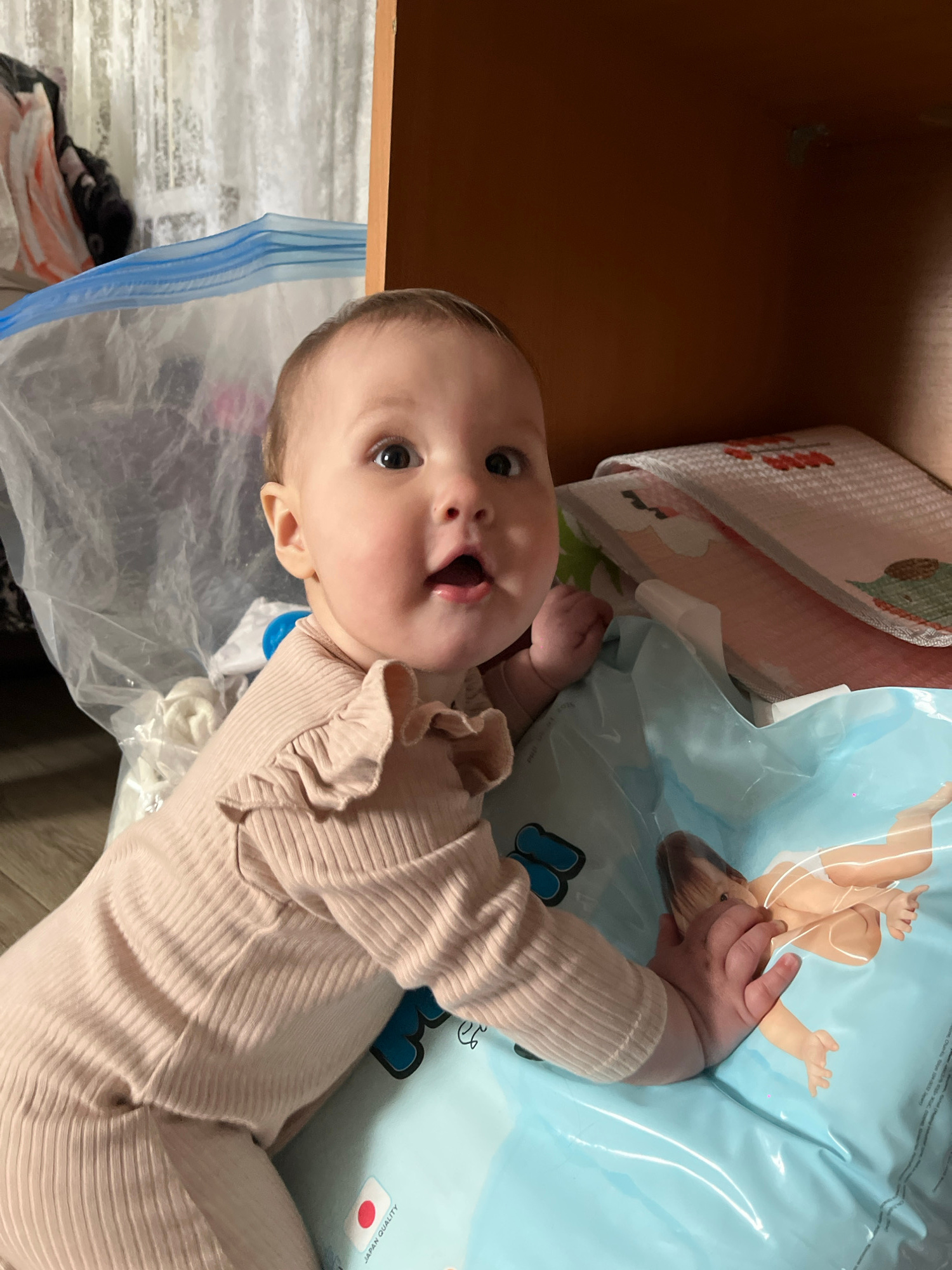 A baby with light skin and a surprised expression lies on a blue package with an image of a baby printed on it, inside a drawer or cabinet. The baby is wearing a pink ribbed outfit. A partially visiblβ¦read more