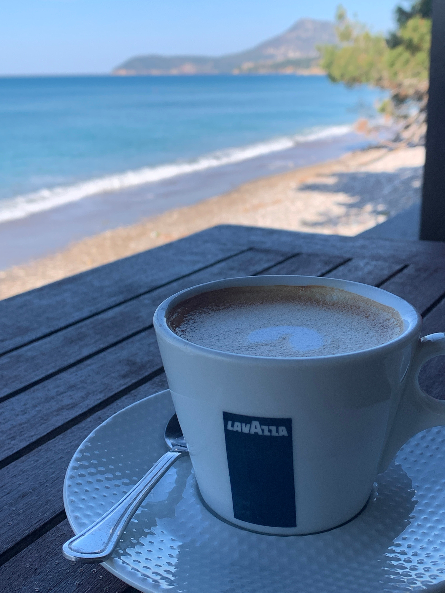 An eye-level, outdoor shot shows a Lavazza cappuccino, with a spoon on a white patterned saucer, set on a gray wooden table. In the background, out of focus, is the beach and azure sea of Bar, Monteneβ¦read more