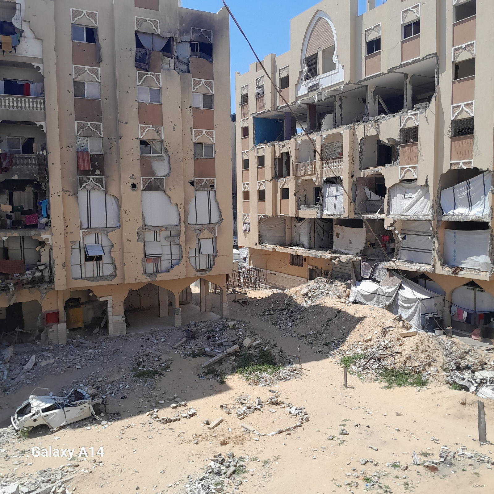 The image shows a building in Khan Yunis, Palestinian Territory, heavily damaged by conflict. Numerous apartments have large holes and are missing walls, revealing exposed interiors. Some windows are…read more
