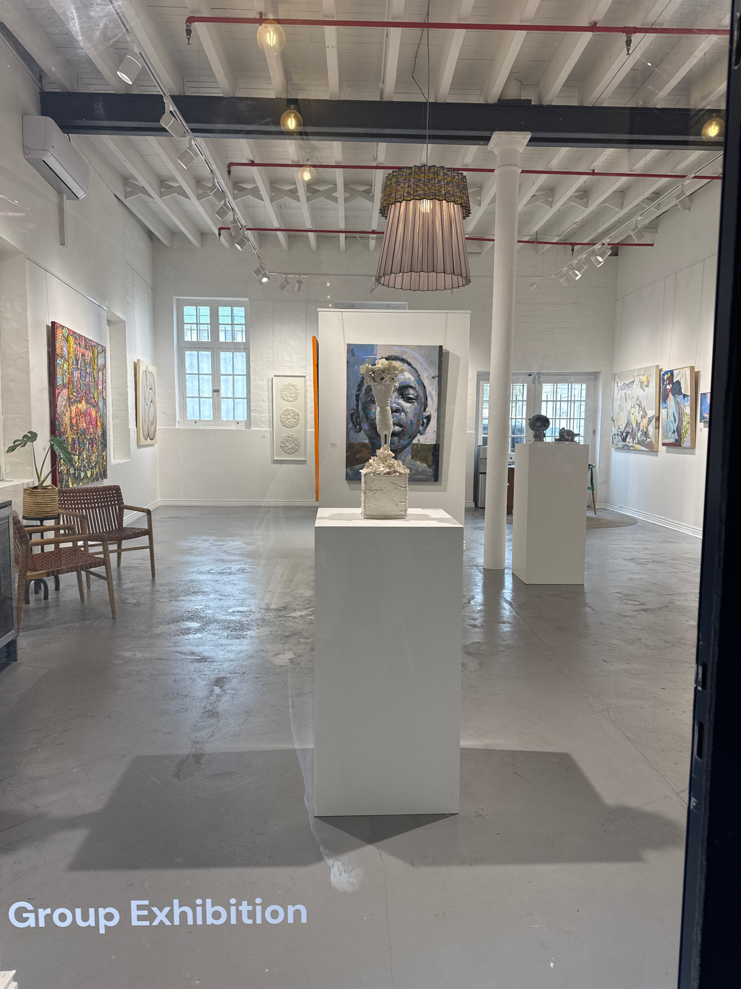 The image depicts the interior of an art gallery in Cape Town, South Africa. The building features white-painted brick walls and concrete flooring, with large windows providing natural light. The gall…read more
