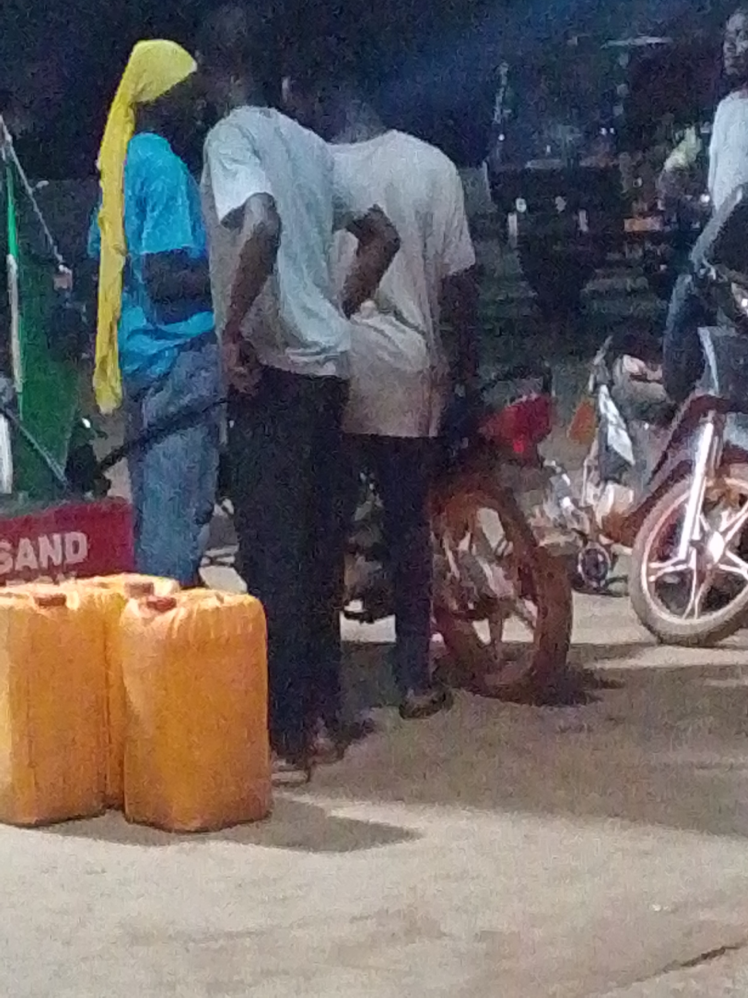 The image, taken at night, shows a street scene in Tamale, Ghana. Several people stand near motorcycles and yellow fuel containers. One person wears a blue shirt and yellow head covering, standing nea…read more