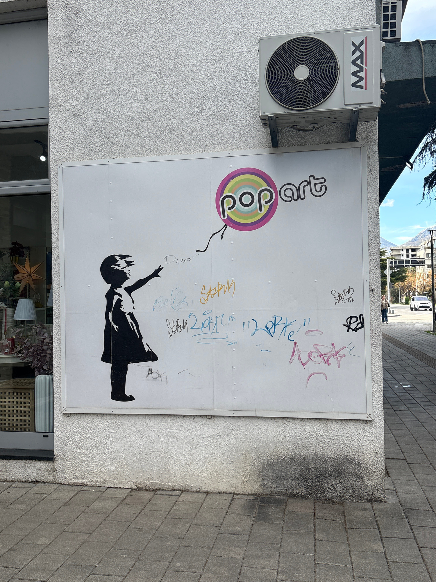 A medium shot depicts a white wall with a commercial sign on a building exterior. The sign features the word "pop art" in stylized colorful letters above a monochrome stencil of a girl reaching for a…read more