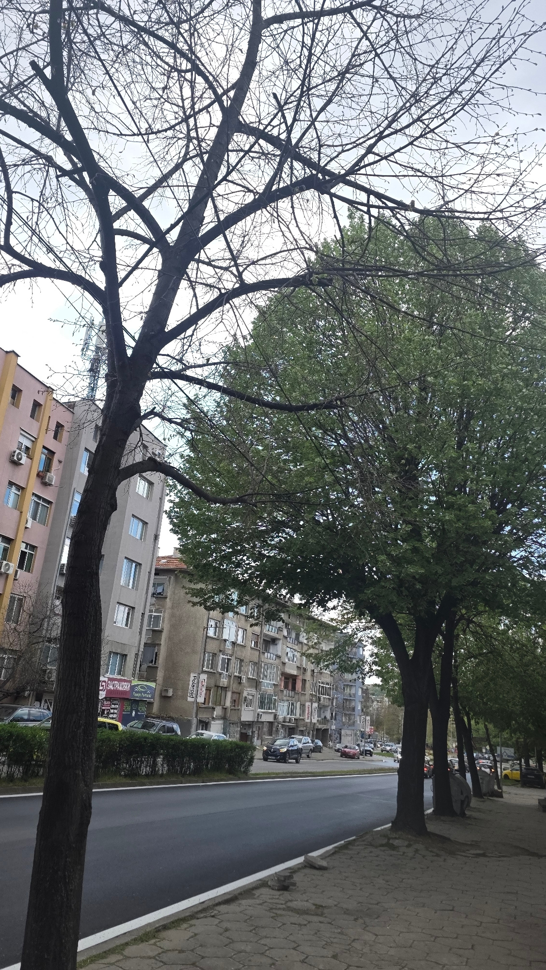 The image captures an urban street scene in Blagoevgrad, Bulgaria, rotated vertically. When viewed correctly, it shows a street lined with trees and multi-story residential buildings under an overcast…read more