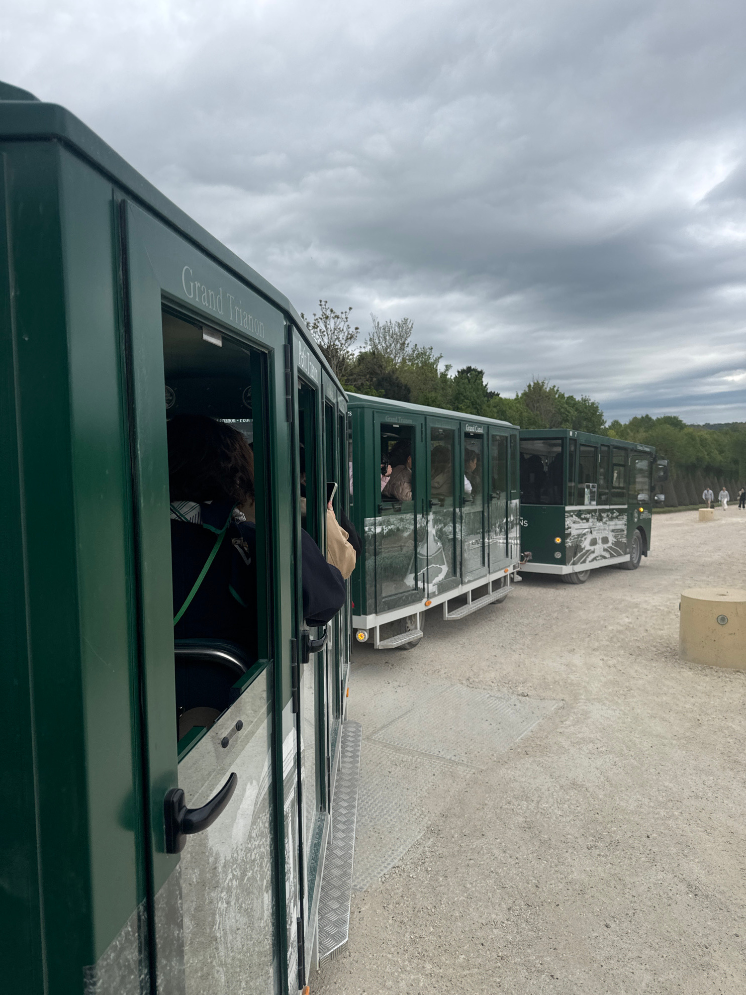 The image shows a green, enclosed vehicle with the words "Grand Trianon" on the side, suggesting a tourist transportation service, in Versailles, France. Passengers are visible through the clear windo…read more