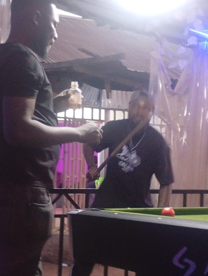 The image depicts an evening scene within a semi-open-air establishment in Barakin Akawo, Nigeria, characterized by dim ambient lighting augmented by bright overhead light sources and purple accent li…read more