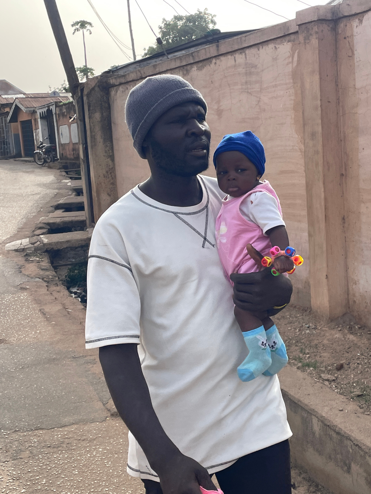 In Jos, Nigeria, a man wearing a gray beanie, white t-shirt, and black pants holds a baby in his arms. The baby is wearing a blue cap, pink dress, and light blue socks. The baby is holding a colorful…read more
