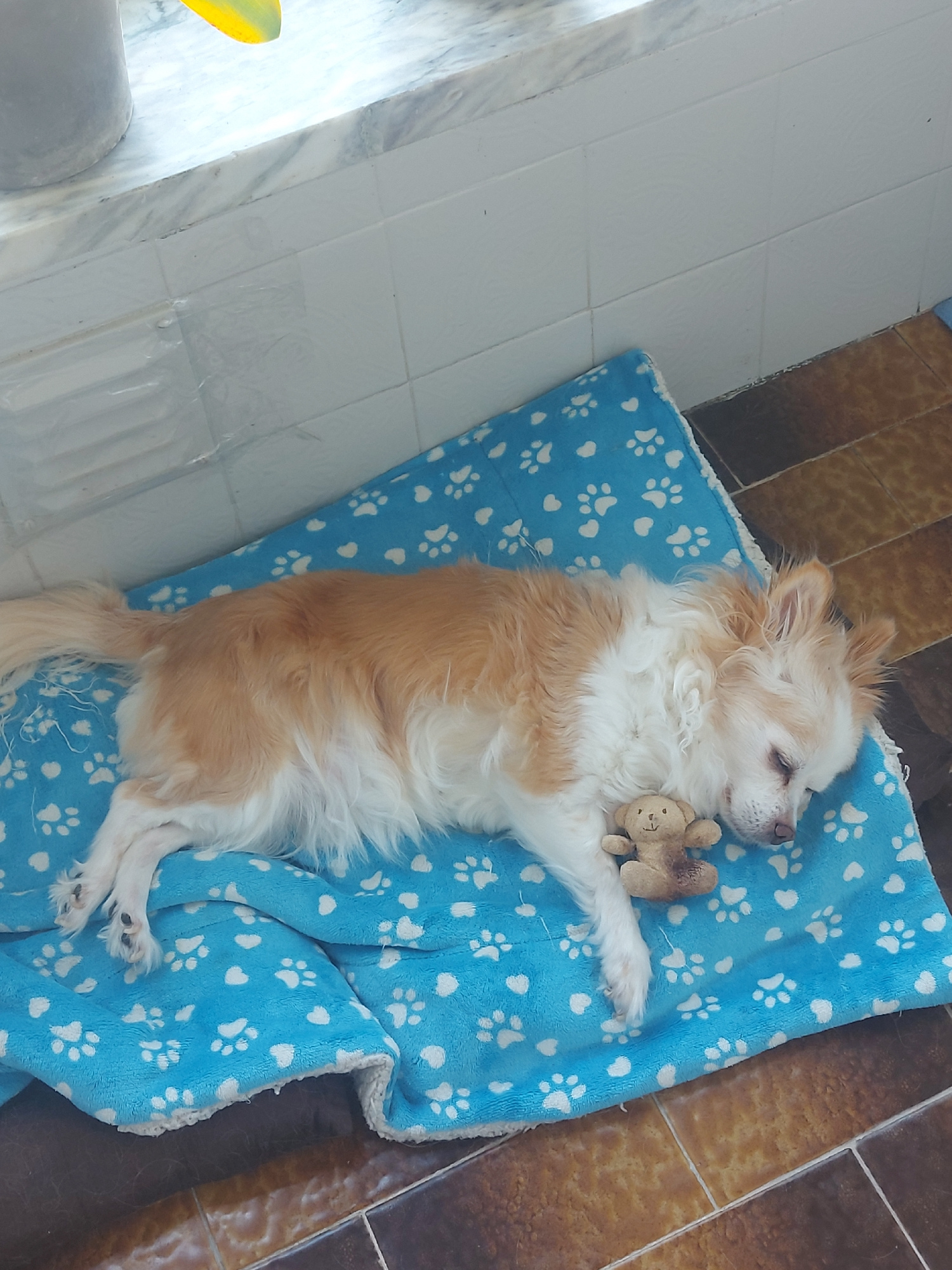 A small, long-haired dog, likely a Chihuahua or Papillon mix, with light brown and white fur, is depicted sleeping peacefully on its side. The dog is resting on a blue blanket patterned with numerous…read more