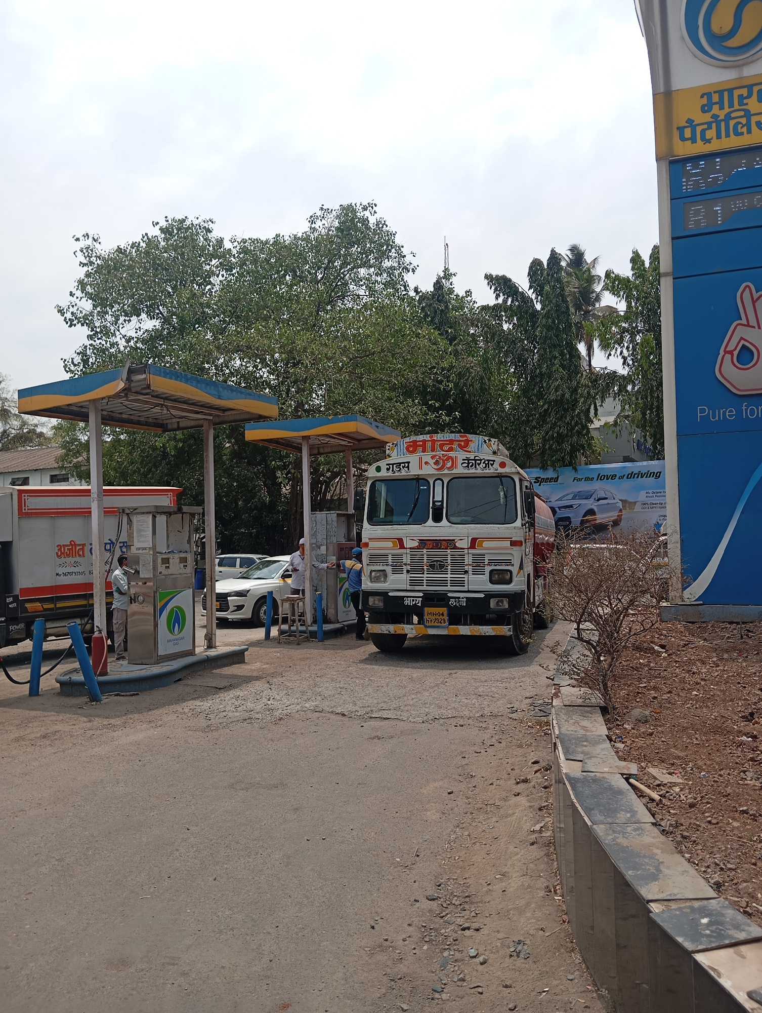 The image depicts a gas station in what appears to be Mumbai, India, as evidenced by the "Bharat Petroleum" sign and vehicle number plates. There's a white truck with "Maa Goods Carrier" written in Hi…read more