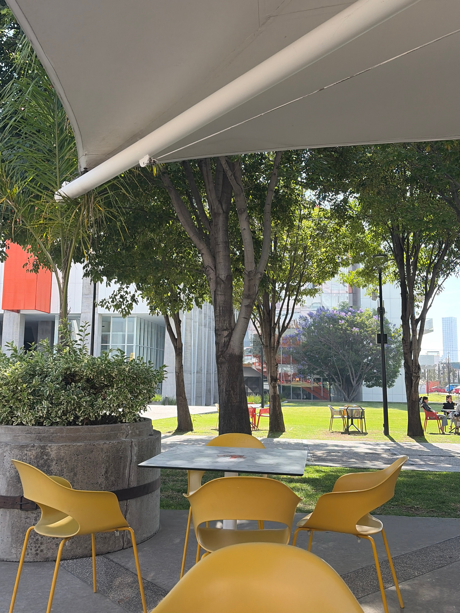 The image shows an outdoor seating area in San Bernardino Tlaxcalancingo, Mexico, possibly a cafe or restaurant patio. Several yellow chairs are arranged around a square table, placed on a concrete ba…read more