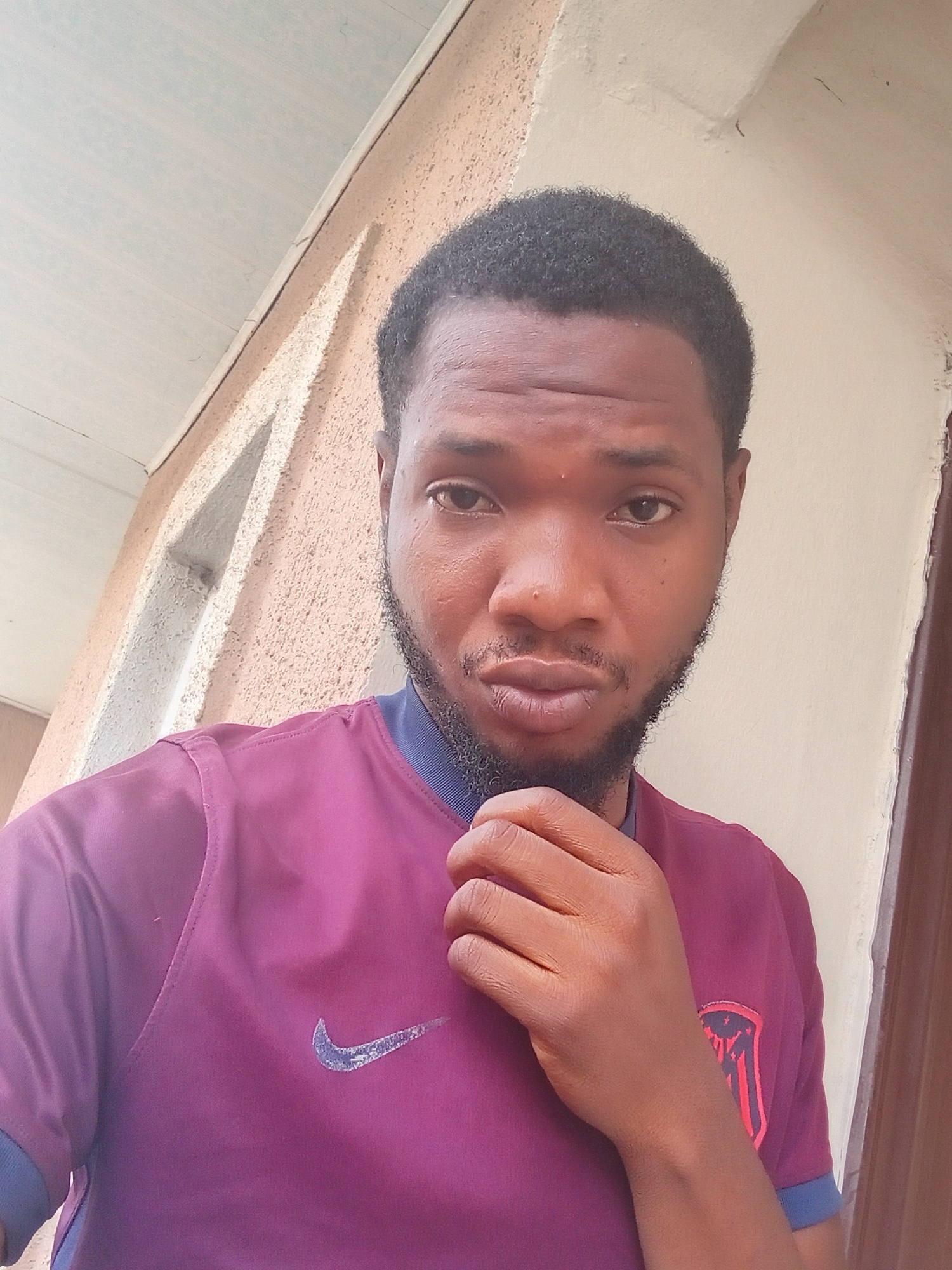 A man is facing the camera. He has dark hair and a beard. He is wearing a maroon shirt with a blue collar and a Nike logo. The background consists of a beige wall. The photo was taken in Zango-ndaji,…read more