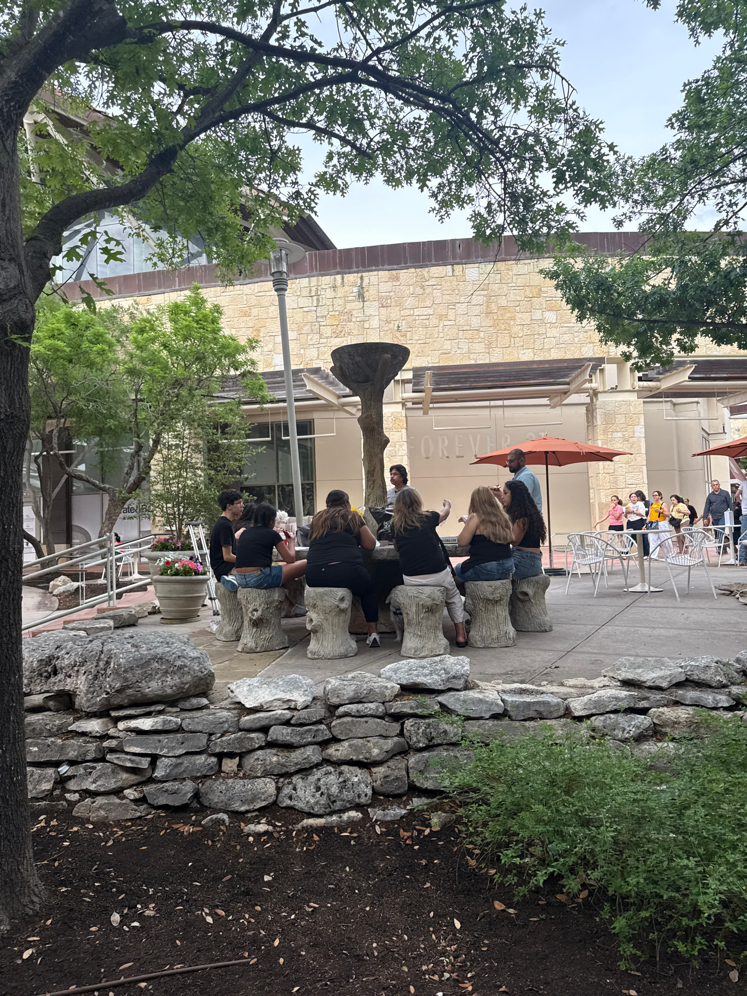 The scene depicts an outdoor area adjacent to a building with the word "FOREVER" visible on its facade, located in San Antonio, United States of America. Several people are sitting on what appear to be faux-stone stools. Additional people are seated at white tables with orange umbrellas in the background. A large, abstract sculpture is visible near the seated group. The area is bordered by a stone wall on one side and is partially shaded by trees. | Open Wire