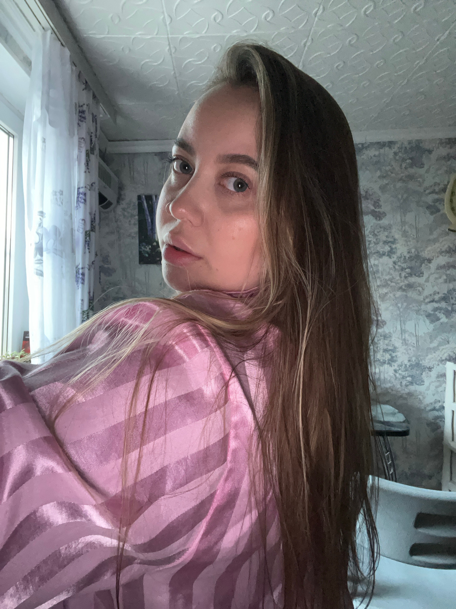 A woman with long, light brown hair is looking at the camera. She is wearing a pink, striped shirt. She has fair skin and brown eyes. There is a white patterned wall to her left. Behind her, there is…read more