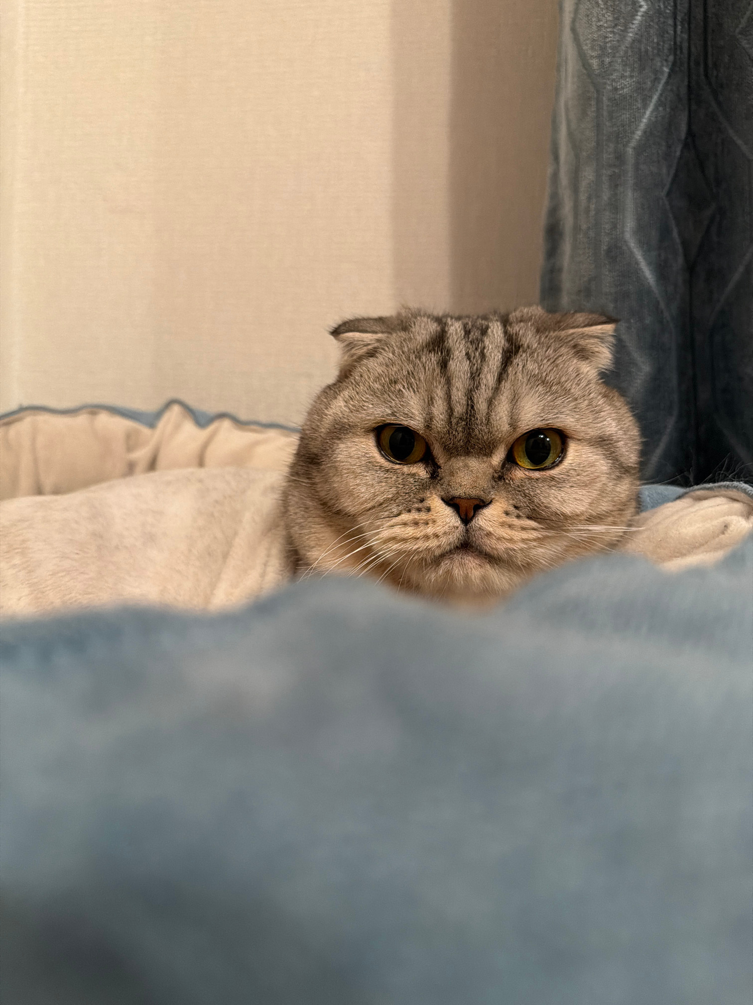 A close-up shot shows a Scottish Fold cat peering from behind a light blue, textured fabric. The cat has grey, tabby-striped fur, golden eyes, and folded ears. The cat appears to be in or near a soft,…read more