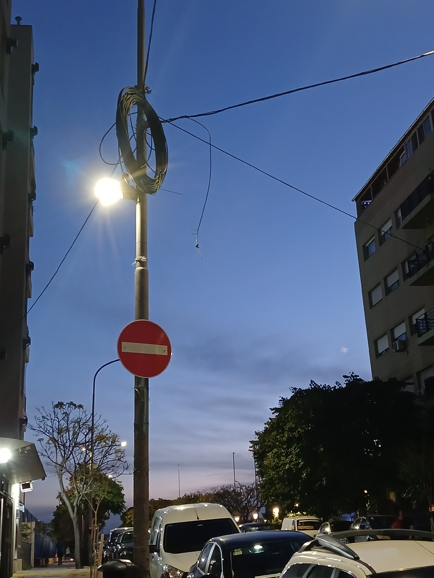 A low-angle shot looks up at a street in Buenos Aires, Argentina at dusk. A building looms at the top left, with a dark green tree and parked cars visible on the right. The sky is a clear blue near th…read more