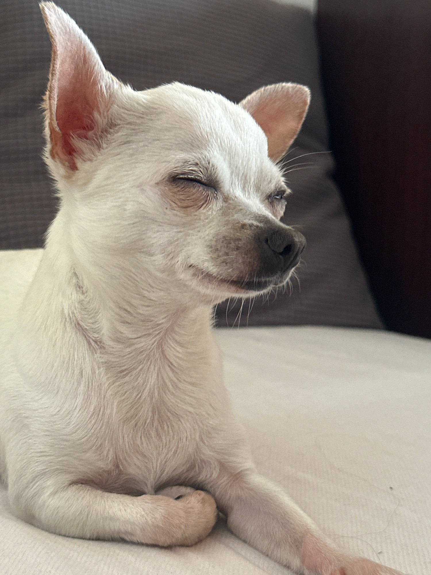 A white Chihuahua dog is lying on a light-colored cushion or blanket. The dog's head is tilted upward, and its eyes are closed. Its front legs are extended and crossed. The dog is resting against a gr…read more