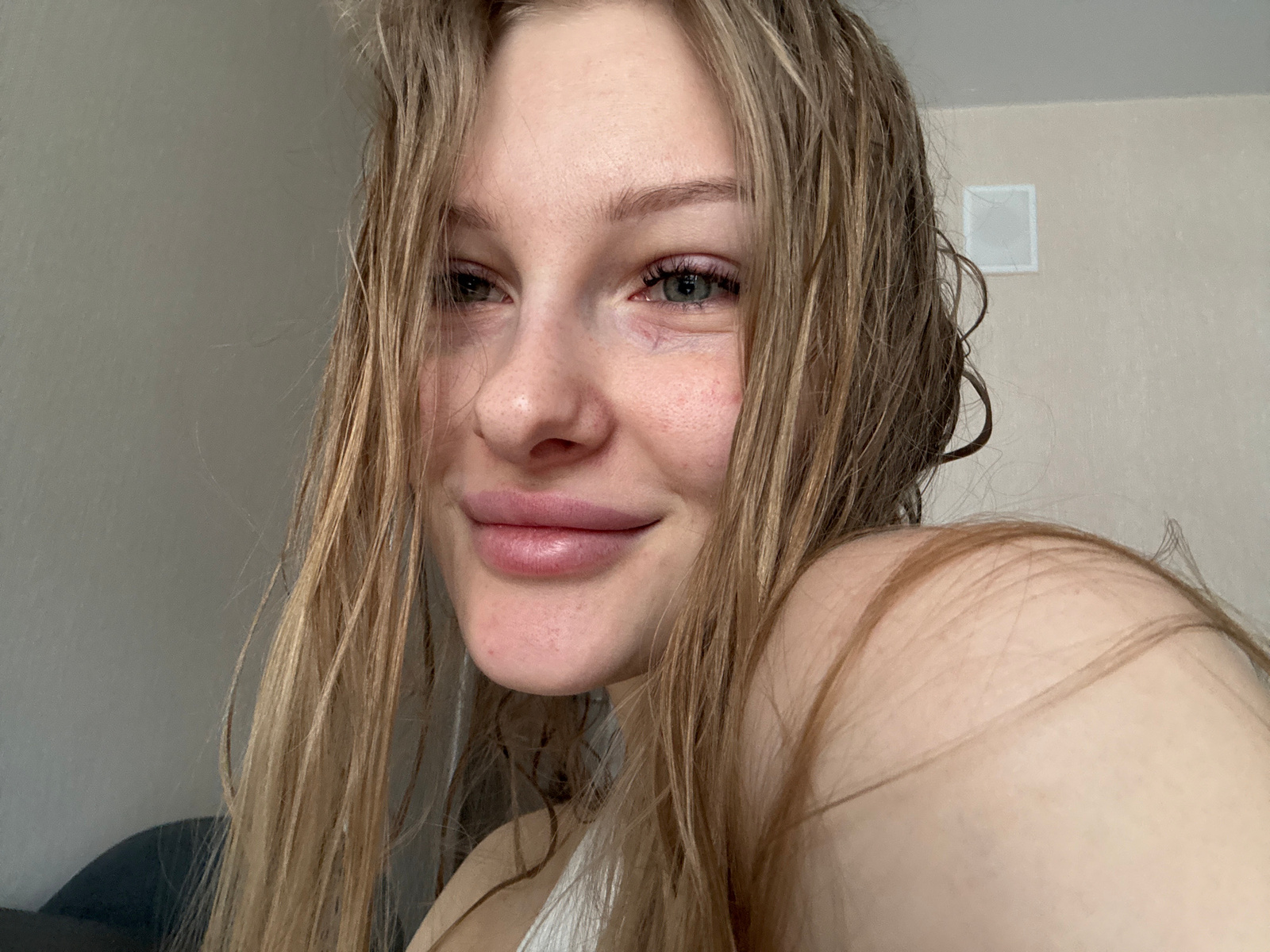 A close-up, upside-down portrait captures a person, likely female, with long, wet, light brown hair. The hair cascades around her face, partially obscuring her features, particularly on the right side…read more