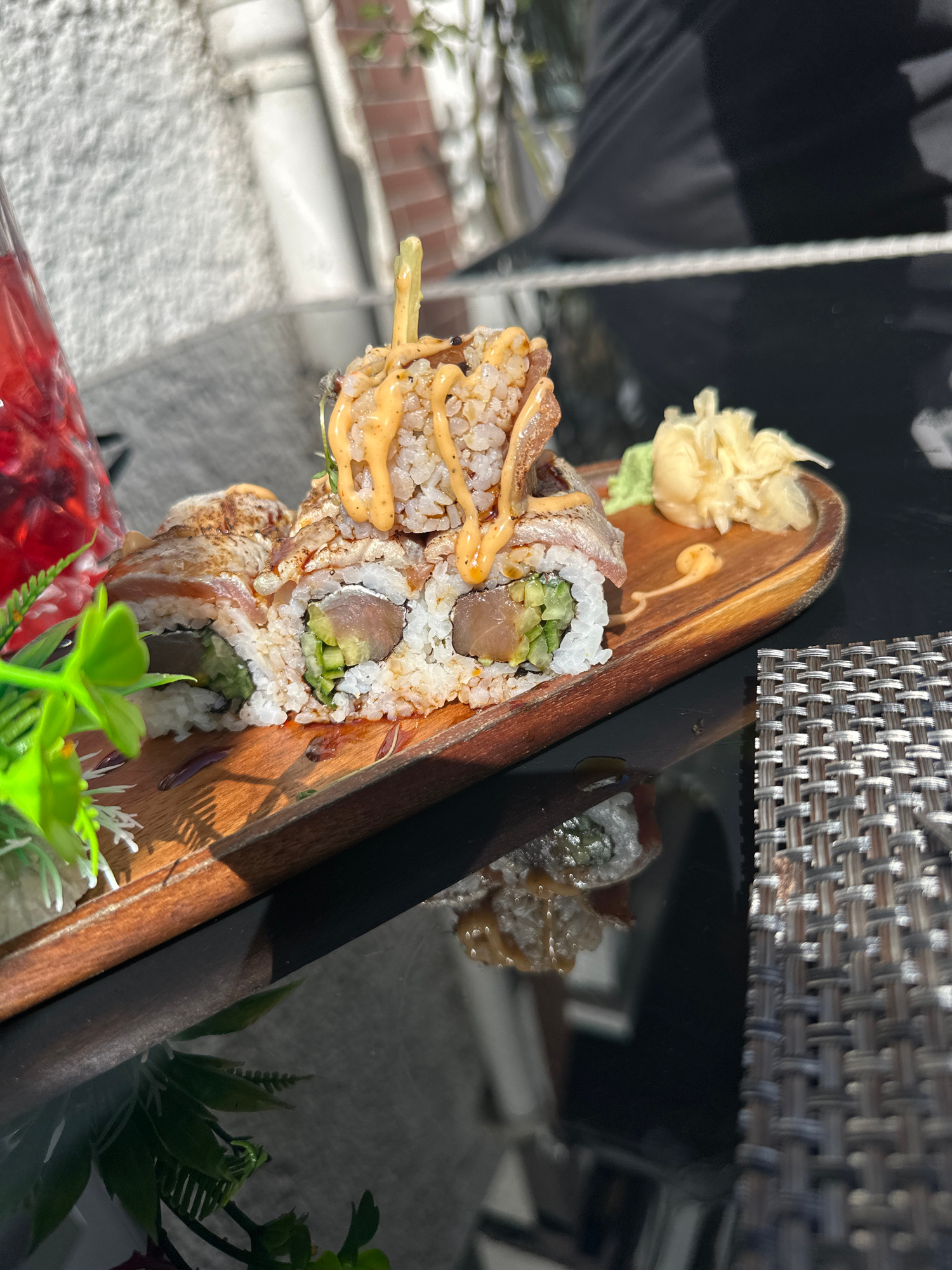 The image shows a wooden serving board with sushi rolls, garnished with pickled ginger, wasabi, and sauce. The sushi appears to be on a reflective surface, likely a table. The backdrop includes elemen…read more