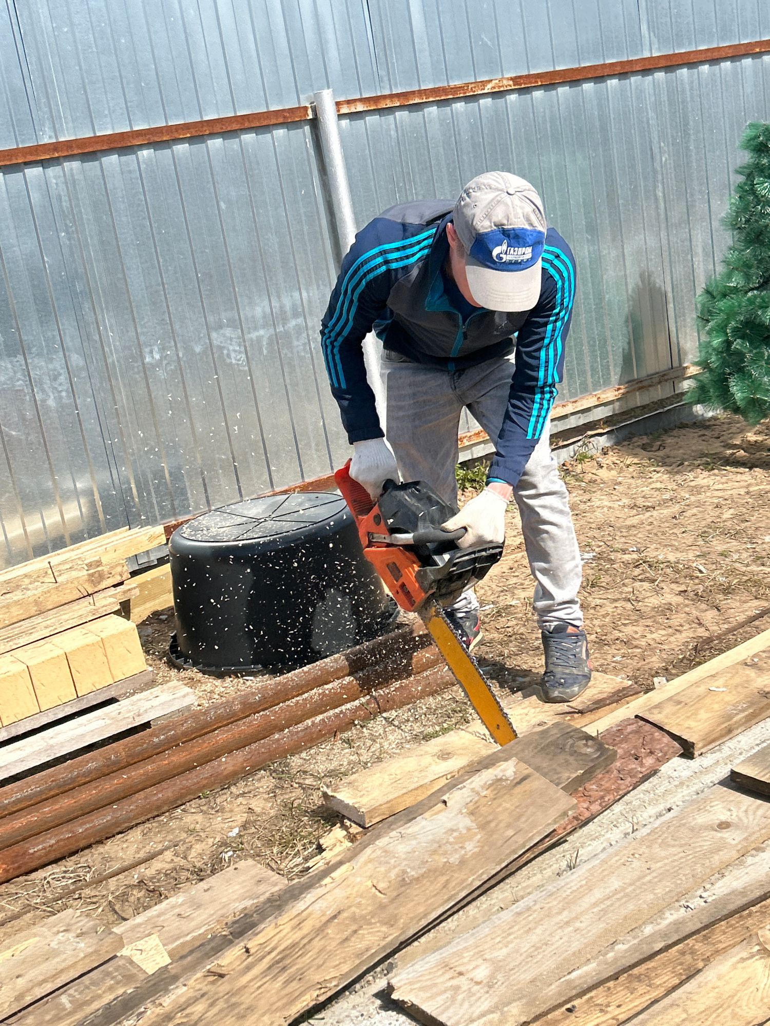 An overhead photograph captures a person, likely male, actively cutting wood with a chainsaw in an outdoor setting in Chaikovsky, Russia. The individual is dressed in a dark blue and black track jacke…read more