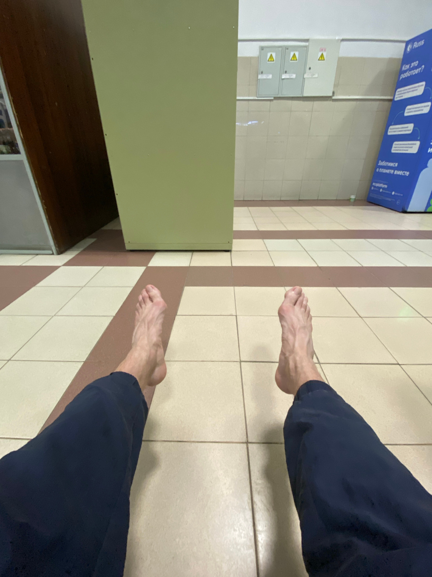 This image, rotated 90 degrees counter-clockwise, depicts a first-person view of a person resting indoors, with their bare feet and lower legs in dark trousers visible. The perspective suggests the pe…read more