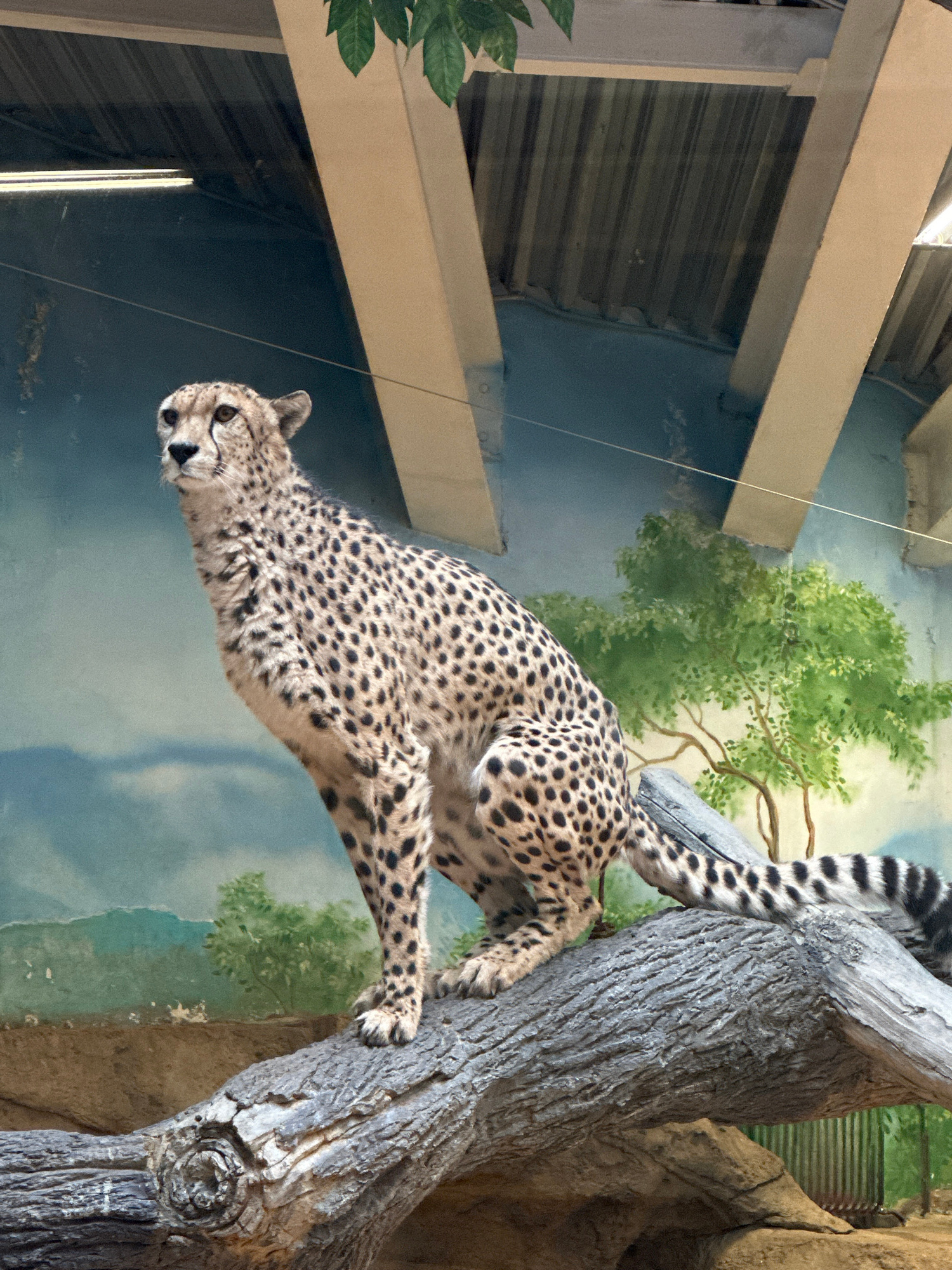 A cheetah is posed as if climbing on a tree branch in an indoor enclosure, likely a zoo or wildlife park. The background features a painted mural depicting trees and a sky. Visible structural elements…read more