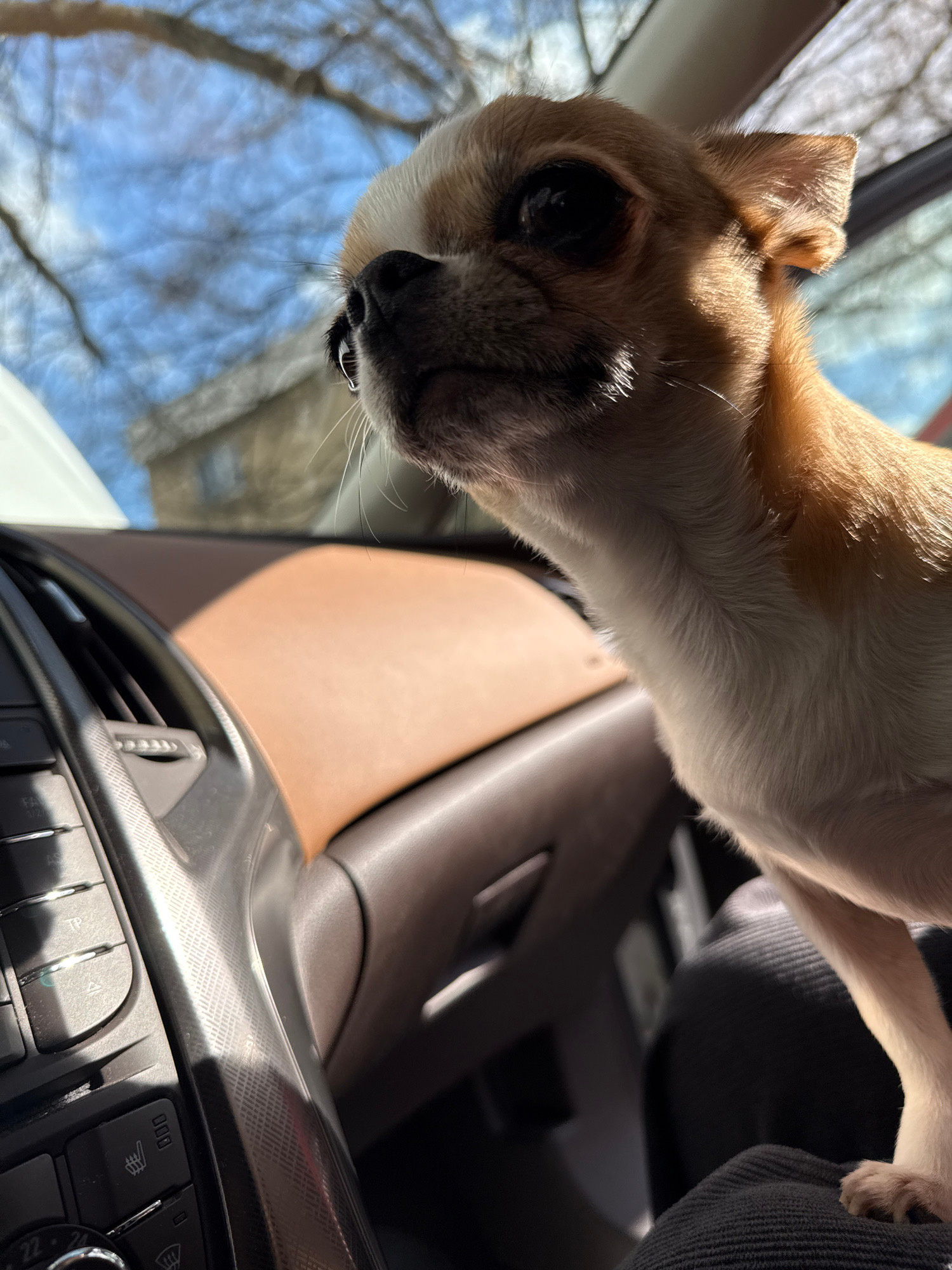 A light tan chihuahua dog is looking up towards the upper right corner of the image from within a car. The dog's head is tilted back, and its face is in focus. The interior of the car is visible, inclβ¦read more