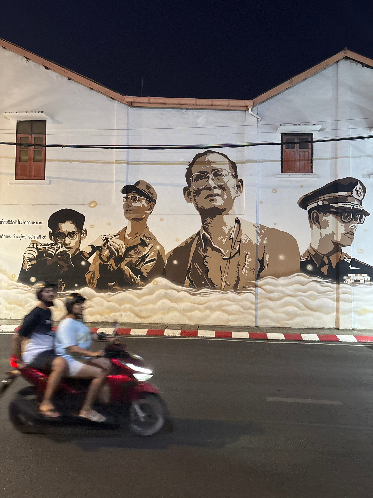 The image shows a mural on the side of a white building in Phuket City Municipality, Thailand. The mural depicts several figures, possibly historical figures, rendered in sepia tones. The building has…read more