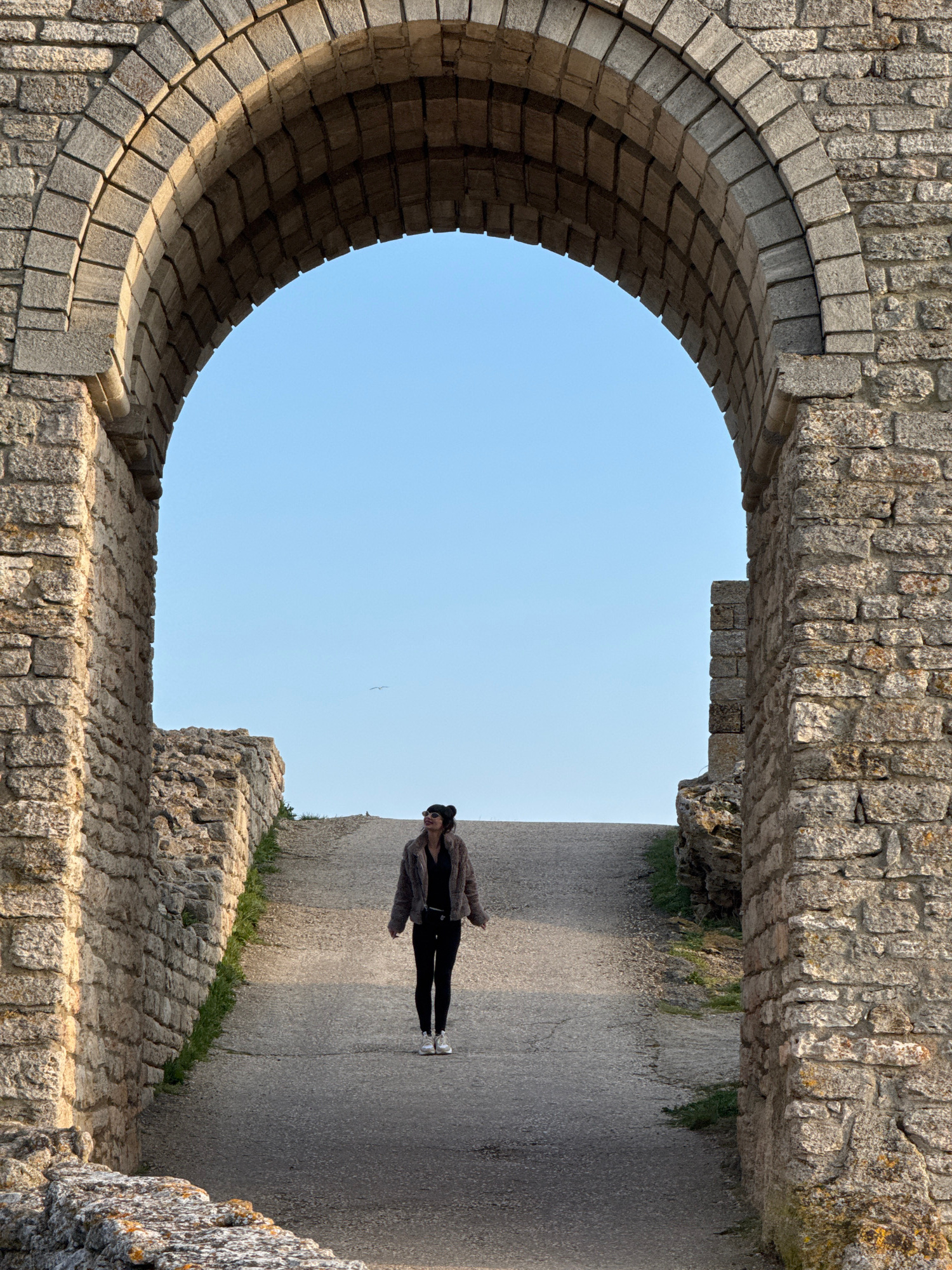 A person is standing on a path, framed by a stone archway and stone structures. The archway opens to a view of a clear blue sky with a bird. The path appears to be part of ruins or an old fortress. Th…read more
