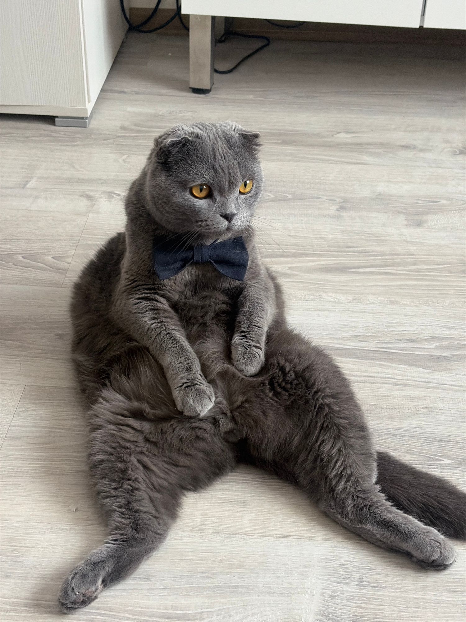 A grey Scottish Fold cat is prominently featured, lying on its back on a light-colored wooden floor. The cat has distinctive folded ears and bright amber eyes, which are wide open and looking upwards,…read more