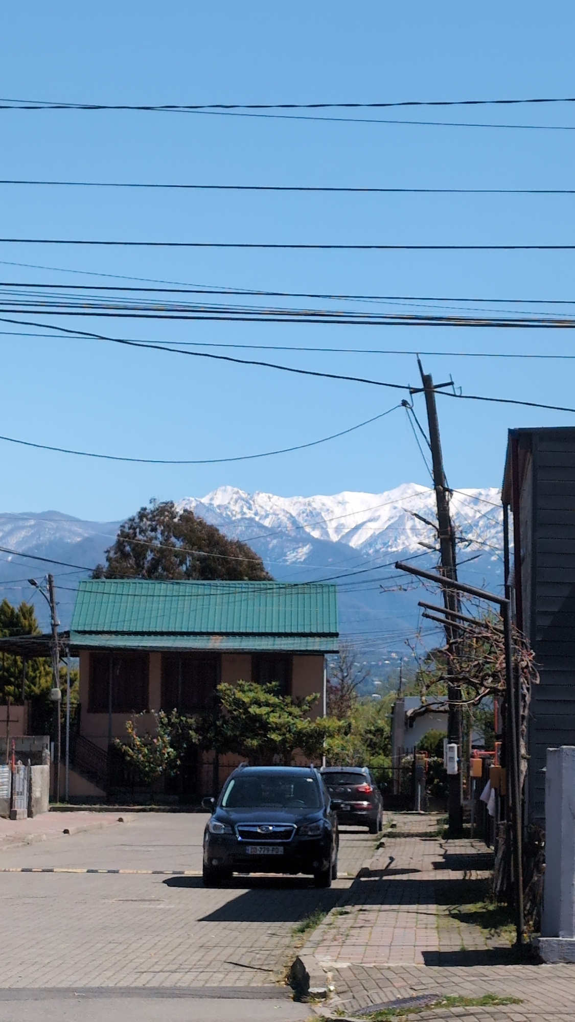 The scene shows a street view, likely in a residential or mixed-use area, with a mountain range visible in the background. The sky is clear and blue. Power lines run across the upper left portion of t…read more