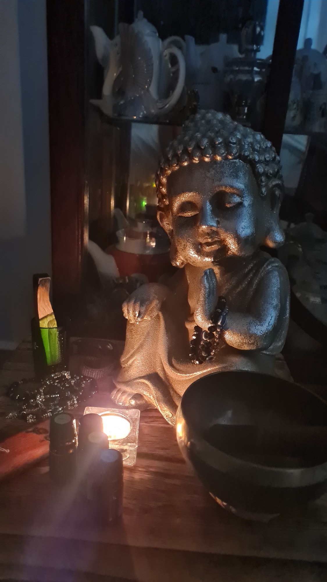 The image presents a still life arrangement. Dominating the scene is a Buddha statue, likely made of a metallic material, placed alongside a dark metal singing bowl. A lit candle in a square glass hol…read more