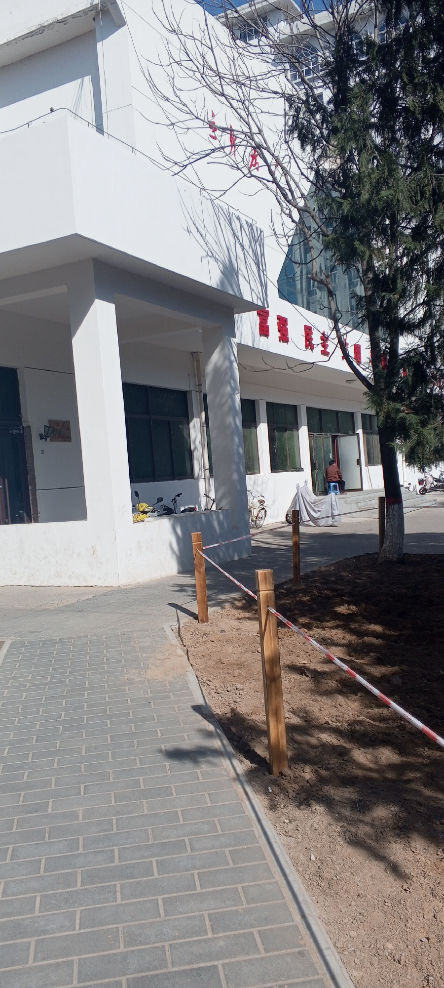The image shows the exterior of a white building, likely a public or administrative building, in Baota District, China. Red Chinese characters are visible on the building's facade. A paved walkway wit…read more