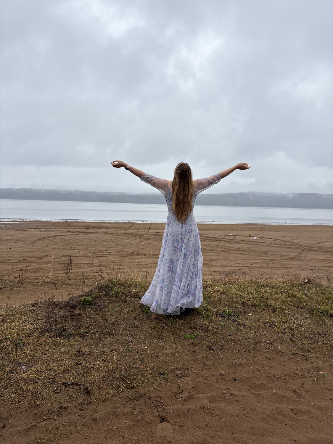 The image depicts an outdoor scene featuring a young woman standing on the shore of a large body of water under a cloudy sky. The woman, seen from behind, is positioned slightly off-center to the righ…read more