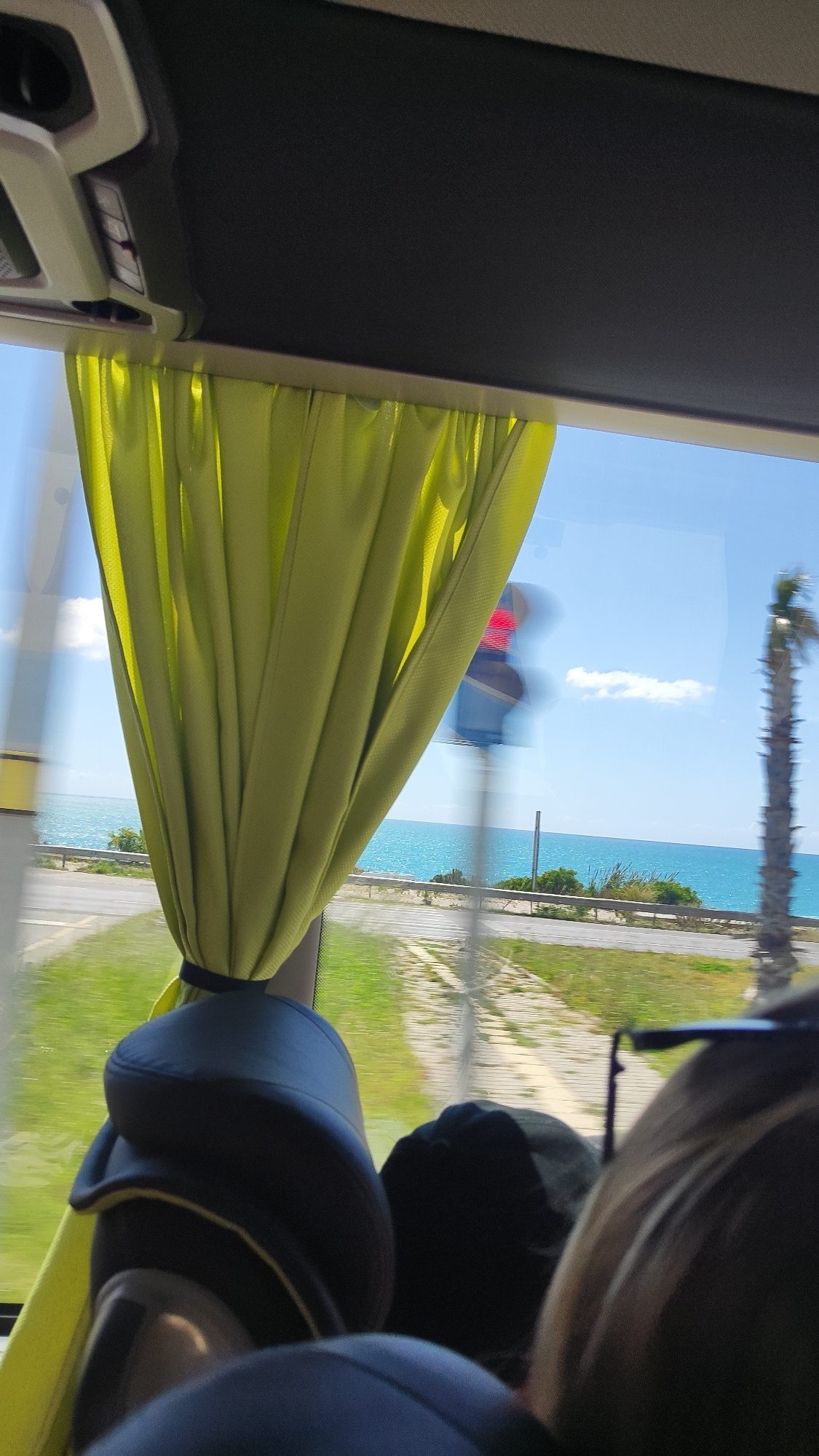 The image depicts a view from inside a vehicle, possibly a bus, in Manavgat, Turkey. A light green curtain partially obscures the window, which reveals a scene of a highway running alongside a coastli…read more