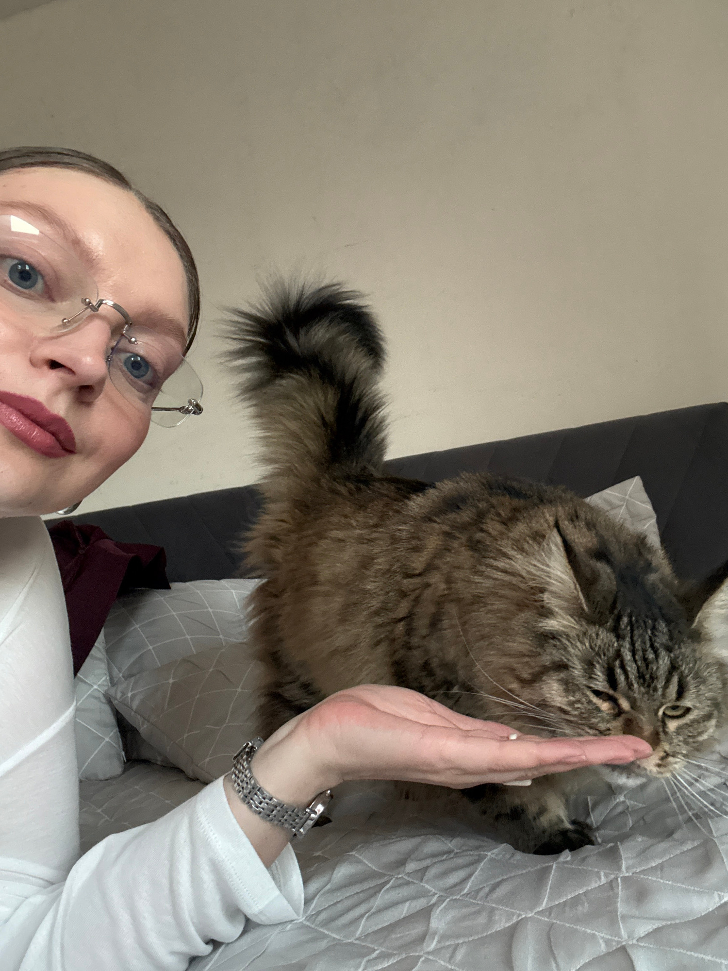 A selfie taken from a low angle captures a woman with fair skin and blue eyes, wearing rimless glasses and dark red lipstick. Her hair is pulled back. The woman is wearing a white, long-sleeved shirt…read more