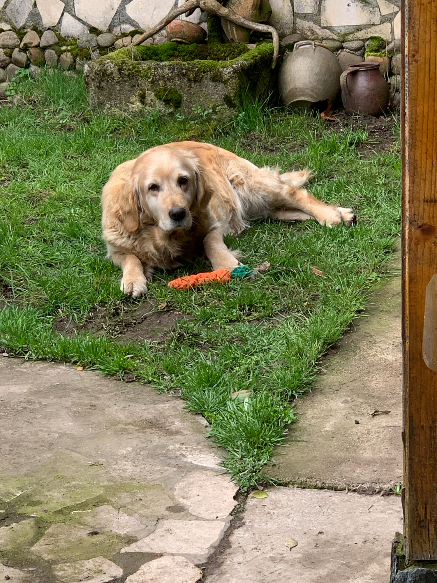 A medium-sized, light-golden retriever lies on its side in the grass. A soft toy, resembling a carrot, lies next to it. The dog has soft brown eyes and appears relaxed. To the left of the dog is a sto…read more