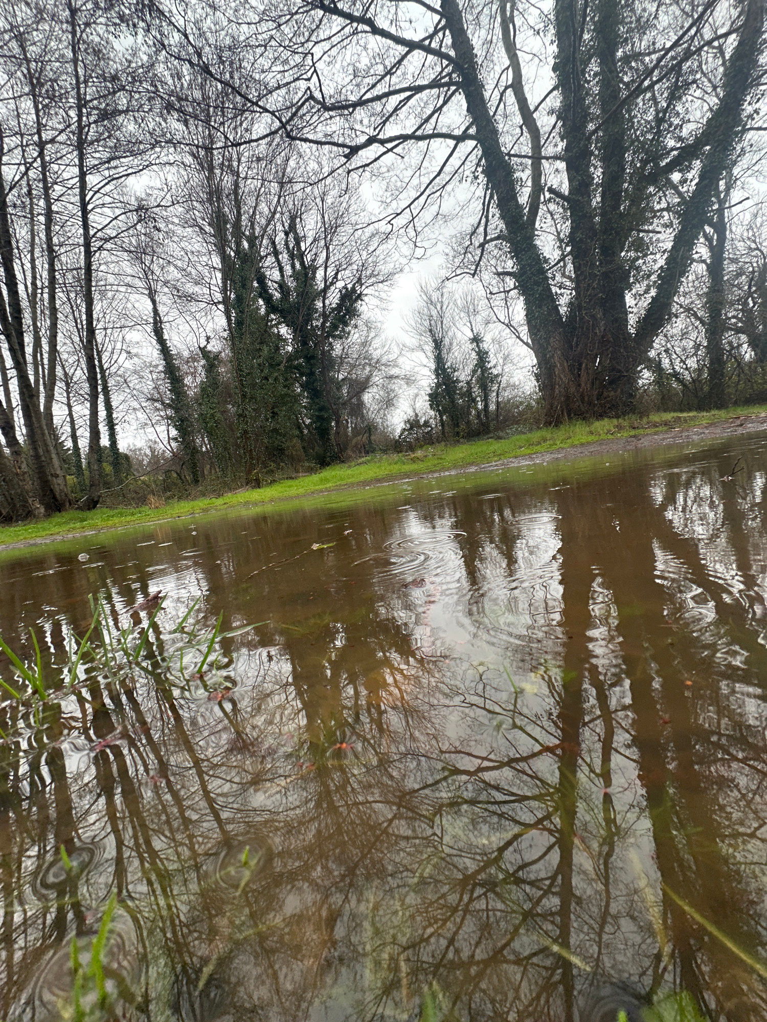 The image depicts a flooded path in a wooded area near Kiten, Bulgaria. The path is partially submerged in murky water, reflecting the bare trees and overcast sky above. Green grass lines the edge of…read more