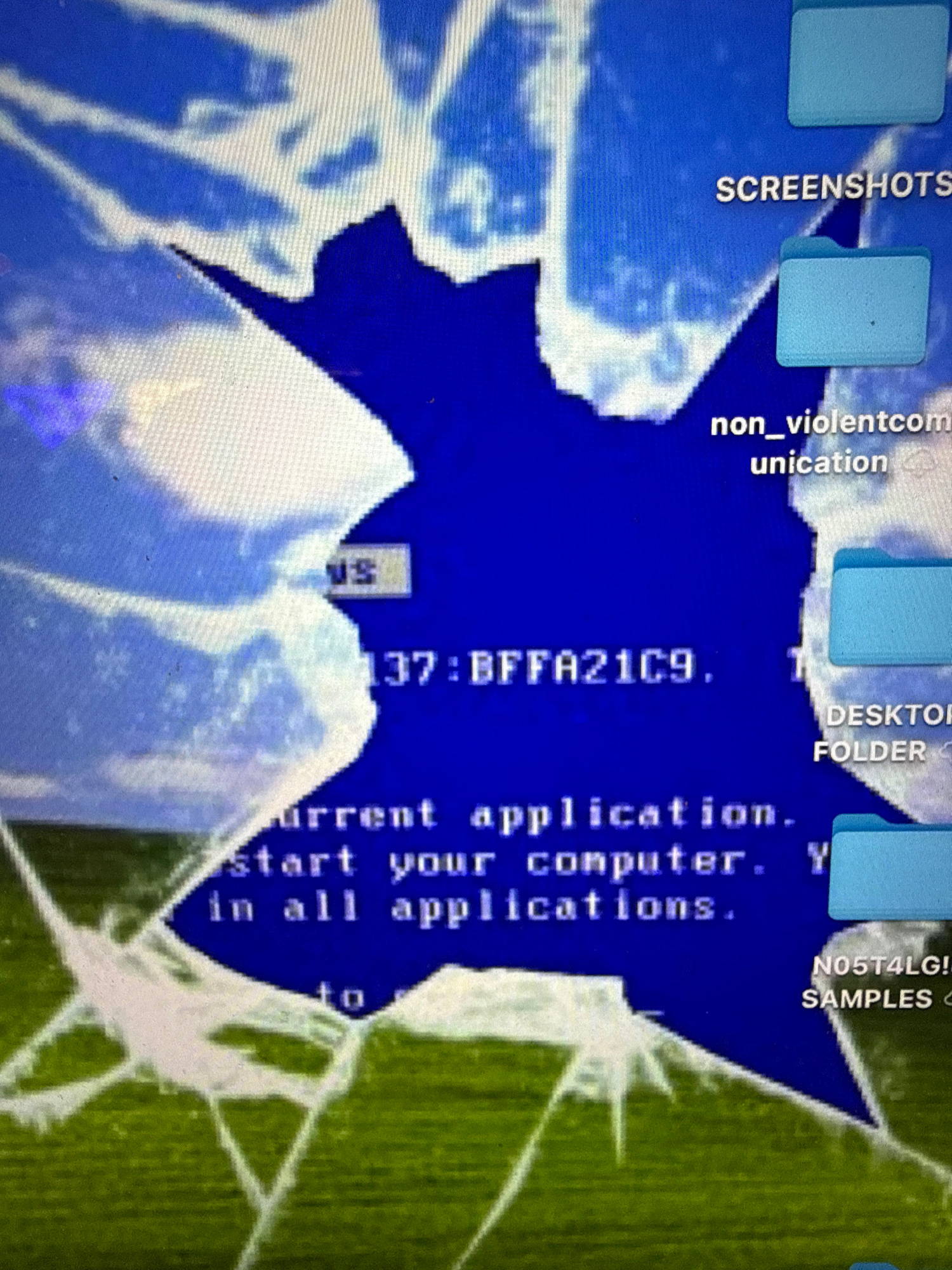 The image depicts a computer screen with the Windows Blue Screen of Death (BSOD) displayed. The screen shows the error message containing information such as "BFFA21C9" and mentions "current applicati…read more