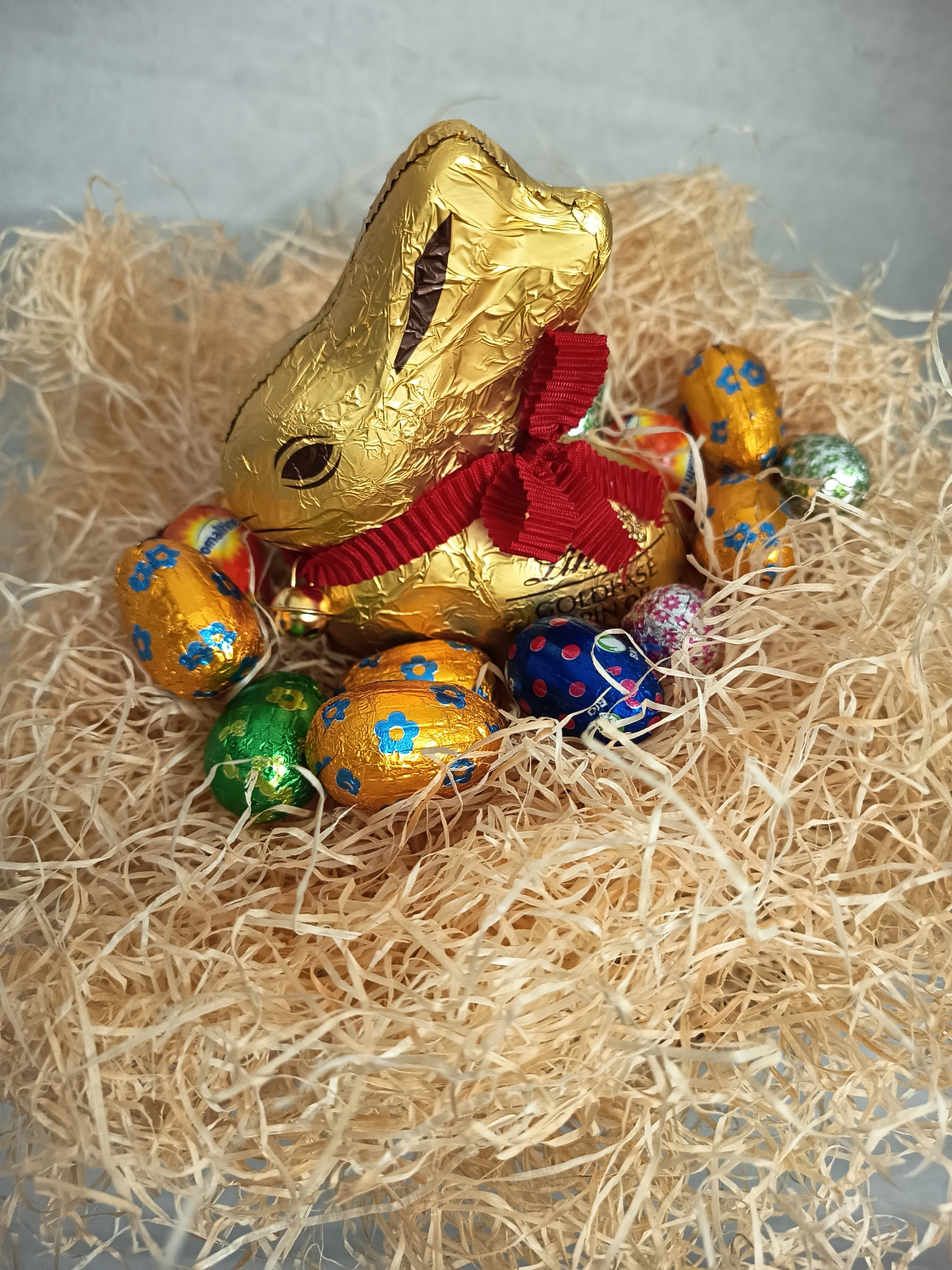 A photograph depicts a gold foil-wrapped chocolate bunny, adorned with a red ribbon, surrounded by numerous small, foil-wrapped chocolate eggs, arranged within a bed of wood shavings. The eggs are wra…read more