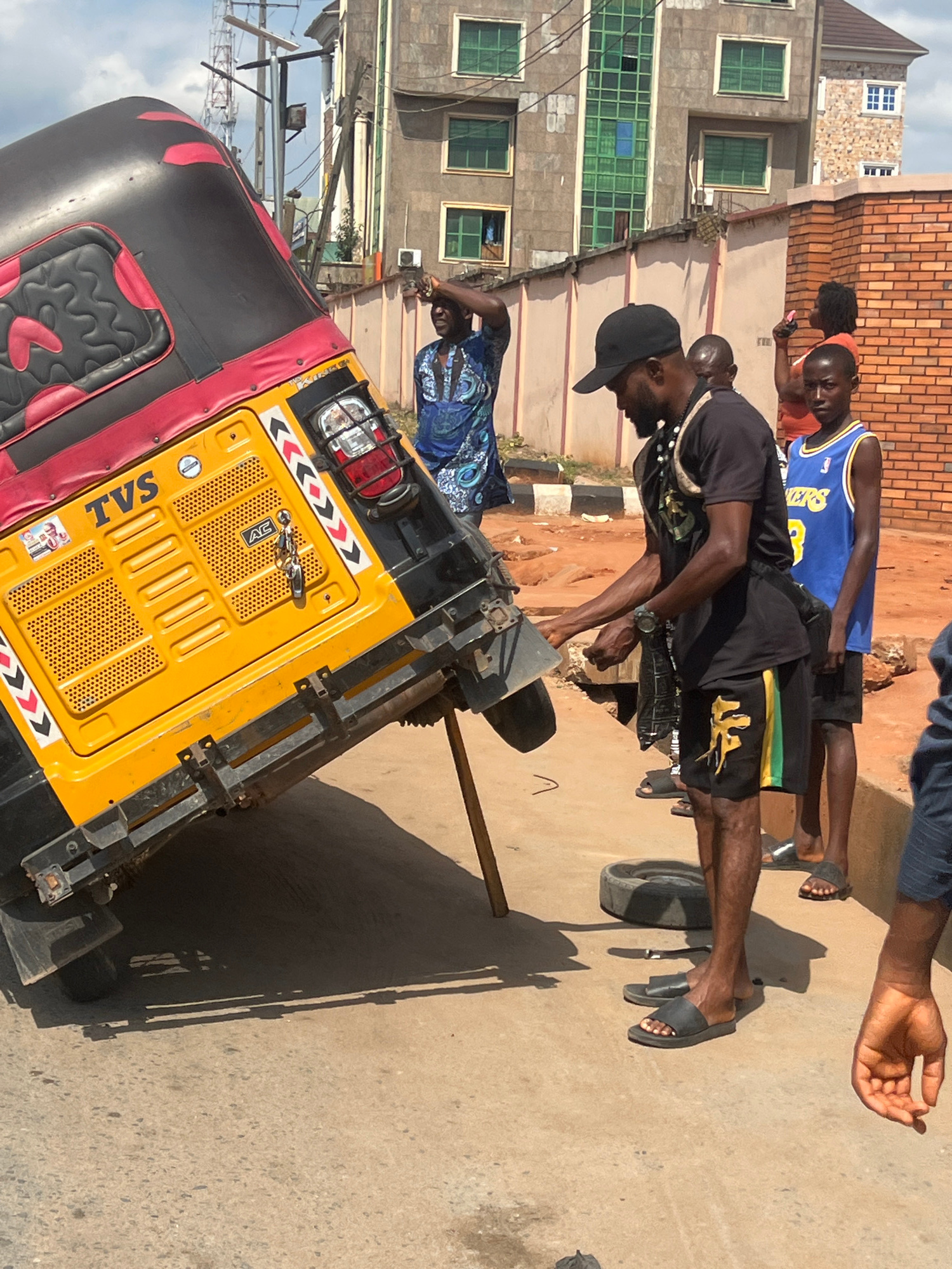 The image depicts a vibrant street scene, likely in an urban or semi-urban setting such as Onitsha, Nigeria. The bright, clear sunlight indicates it is daytime, casting distinct shadows on the concret…read more